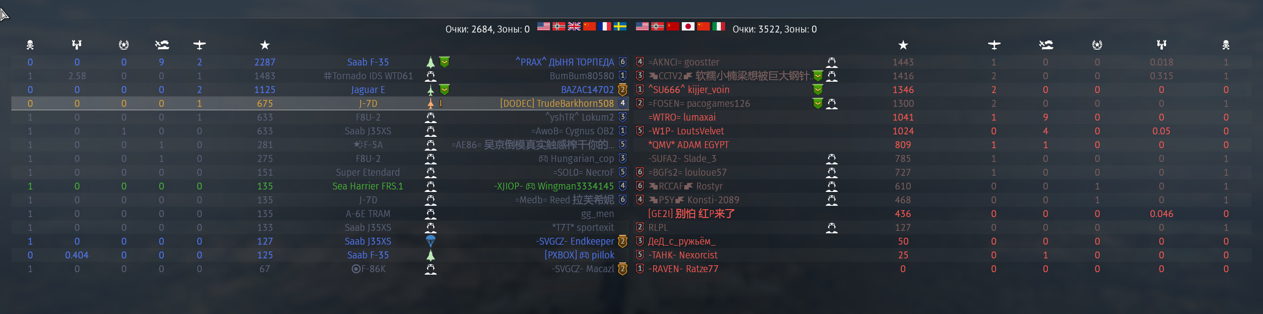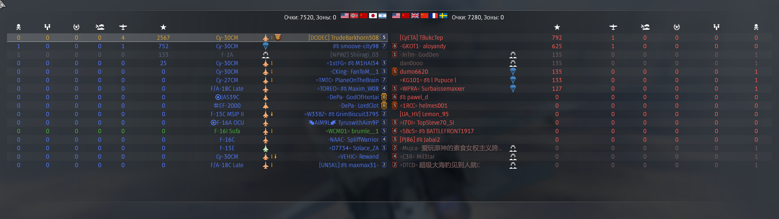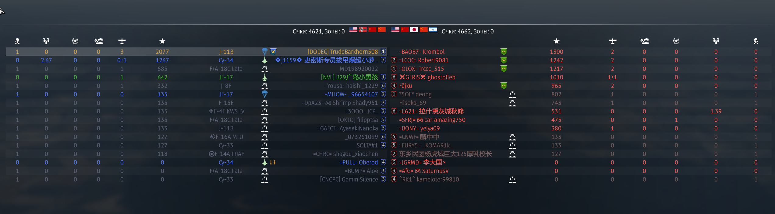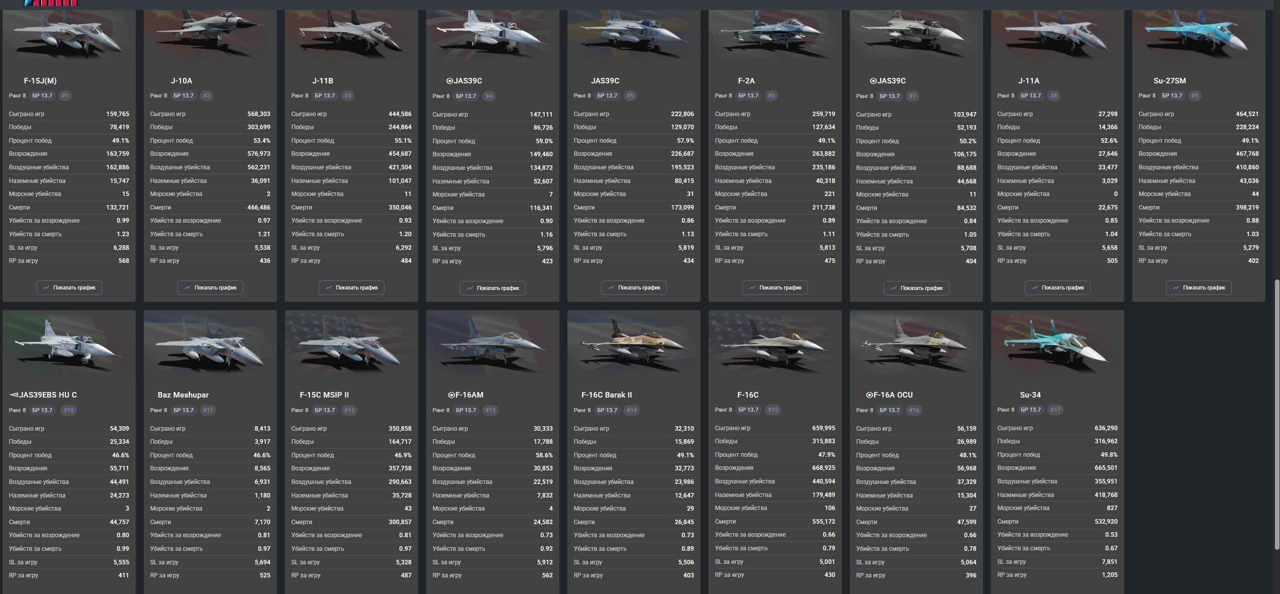 Сортировка по КД 13.7 самолетов. У китайцев такие же показатели как у Ф-15J(M) но в 5 раз(!!!) больше боев. И да учитывая что JM лучше 15С и на том же бре... И эти показатели лучше любого натолитака кроме французов. Но у тех - мики.