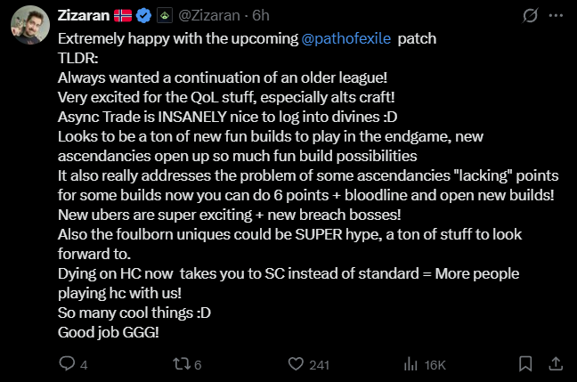 Я короче понял почему у меня нету вайба играть в пое1! Потому что уверен что игру закроют! Раньше я играл лиги зная что перенесу свой опыт игры на след. лигу а сейчас не уверен что след. лига вообще будет и поэтому становиться сильнее в игре я не вижу смысла.