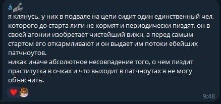 да не нахуй полежал 5 часов так нихуя и не уснул походу организм чует старт лиги и перестраивается под него а тут накладочка вышла что стартовать я не буду вот так вот я и перехетрил организм этот дебильный