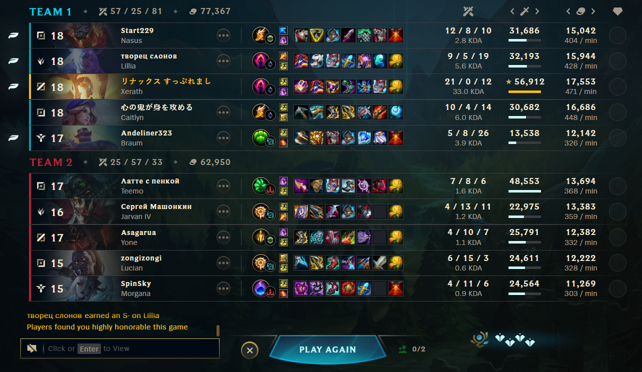 Я получаю два раза подряд: мамкиного тралера, сдохшего на варвике на топлейне от мундо 3 раза за 6 минут, начавшего спамить пингами мне на другой конец карты и сьебавшегося с линии афк фармить мой лес. В следующей игре какой-то чмошник на гарене с арабскими буквами встал в афк под башню, узнав, что против него Аврора. Не ливнул, а просто встал под башню и иногда реколлился, чтоб не дало флаг афк. После 10-й минуты стал дисконнектится и через 10-15 секунд реконнектится. На 19-й минуте на снесли башни у Нексуса, но мы вчетвером отбились, а враги не стали эндить, предпочтя пофармиться и пособирать фуллбилды со всеми объектами, к которым у меня все равно доступа не было. Оставшиеся челы суррить не хотели и мы как-то дотянули до 35-й минуты.