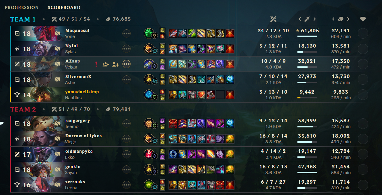 очередной безыдейный проеб с сыном шлюхи на миду пикнувшим вейгара. пик вейгара, кейл, асола на мид = ты проебал игру. только вейгар еще и настолько мусорная хуйня что он в лейте ровно такой же бесполезный