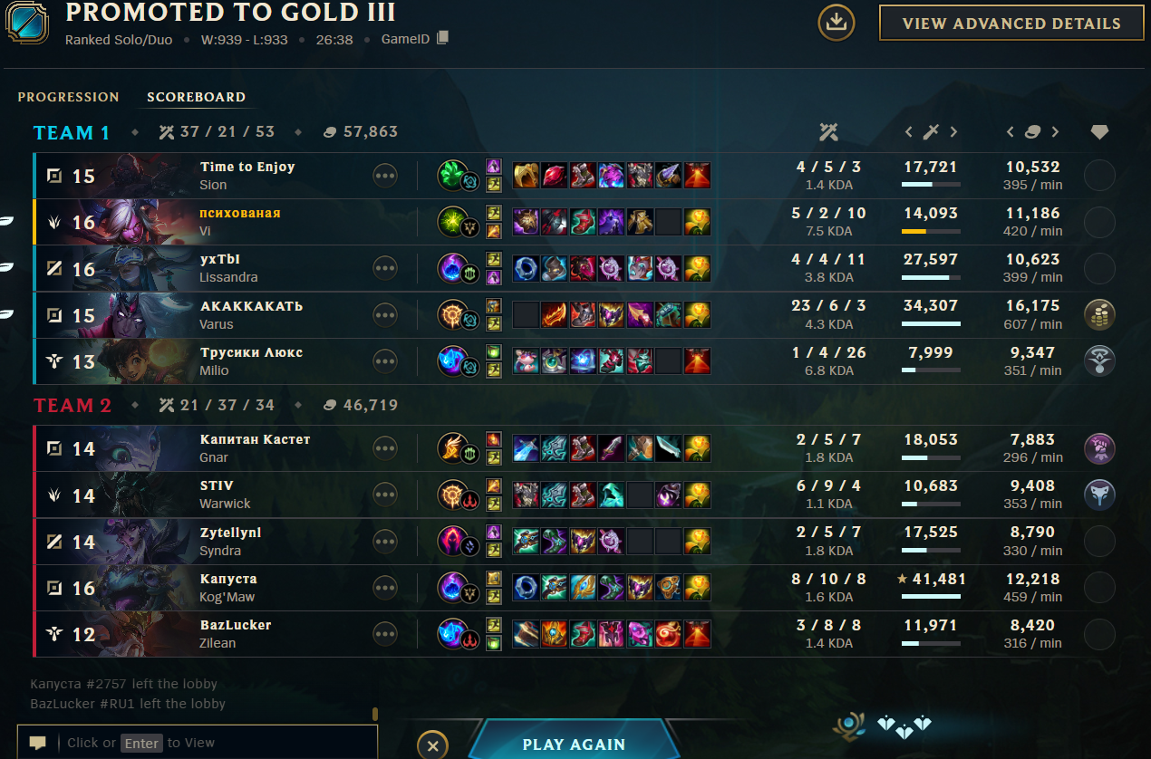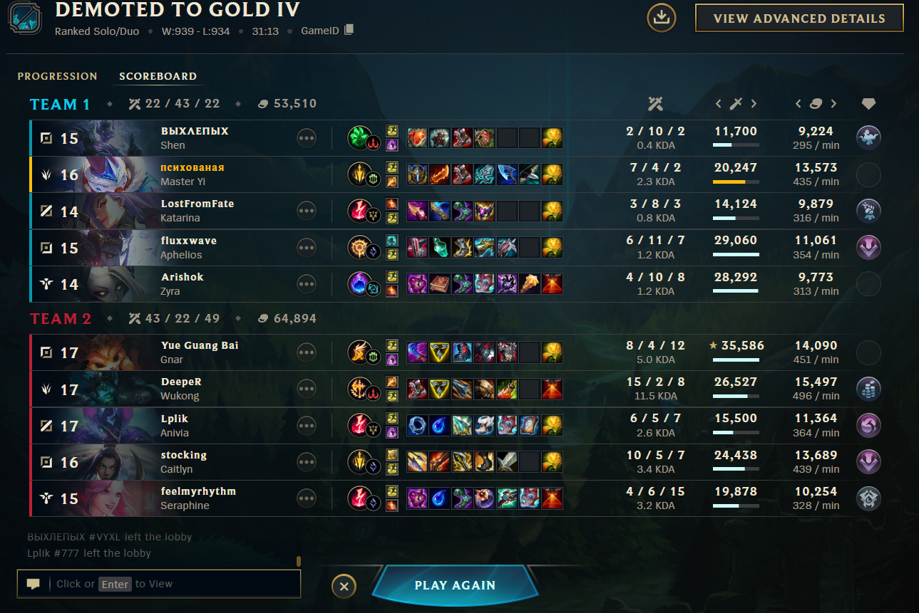 Е3 ранг типы все еще на миде играют сука 150кс на 38 минуте, отставая от люксы сапорта. Может быть он роумил жестко? Нихуя. Векс ходила фармила килы на сайдах, это говно в вышку долбилось афк. Позвал убить уя на дрейке, это подошло, когда дрейк уже кончился и уй убежал) И дегрод афк сплитящий на енэ без тп. Просто пиздец.Абсолютно рандомный разброс по скиллу на любом ранге, просто ничего не значащие циферки, мне кажеться даже в мастере сритокал также пиздато балансить будет. Может общий скилл там выше, но все равно кому то чаликов задротов, кому то лоу мастер рачков с разницей в 1000 лп кидать будут. Ахуительный подбор игроков конечно.