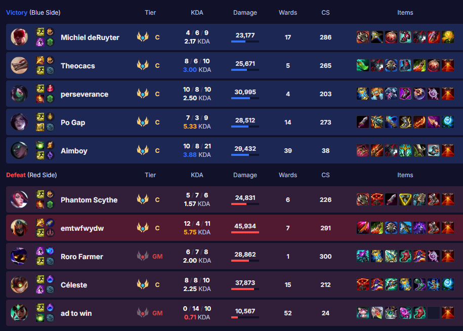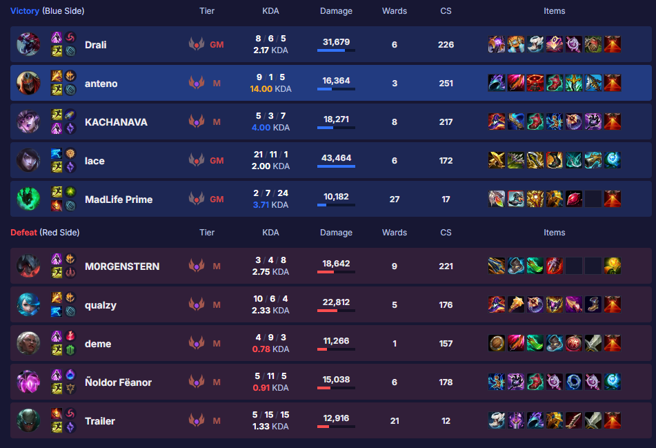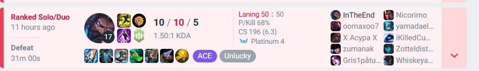 >>50288629 А я иногда ради интереса наблюдаю за акками подобных фидеров. Вот недавно с этим попался https://op.gg/lol/summoners/euw/Gridaher-8513 несколько дней назад, охуительные КДА у него и игры, да? Это хуйло, кстати, зачем-то меня в друзья пыталось добавить - нахуя они это делают?