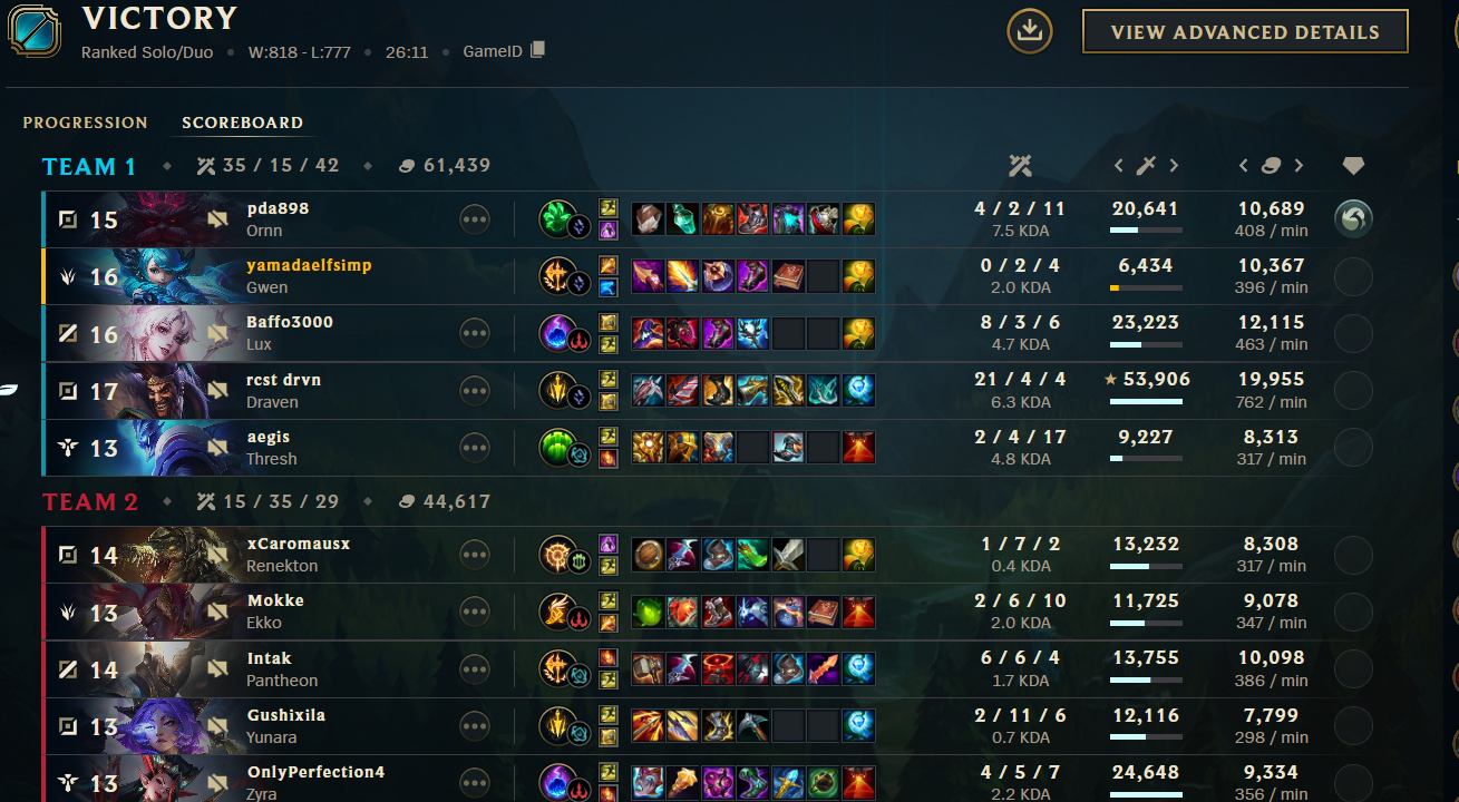 Забавно что при таком счете я топ 1 по фарму на карте. Алсо билд скам, без бурста враги тупо убегают от меня и кайтят, лучше дальше криты буду билдить.