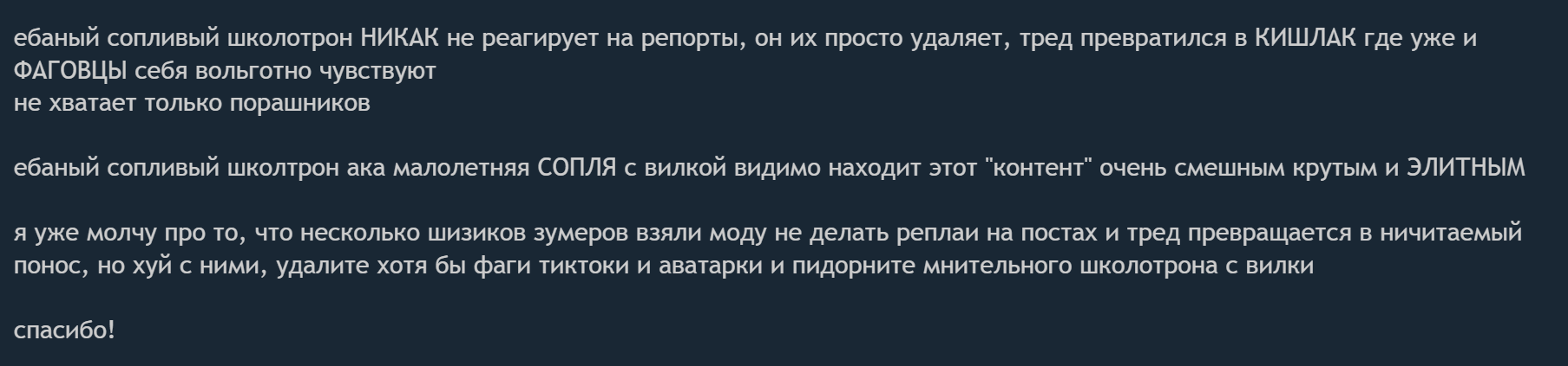 А представьте если бы чмо шизоидное калфяное сразу бы давили нещадно за любой нирелейтед какой был бы кайф, сидели бы сейчас придумывали билды, обсуждали стратки.