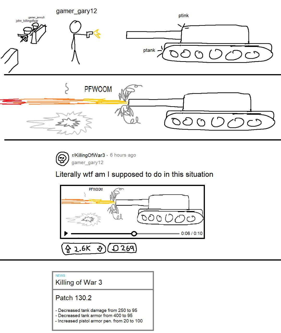 >>50410062 >в чела ты попадешь на любом оружии и будешь убивать Вот только он тебя сбреет метовой пушкой за 0.1 сек в подкате, и хуй ты чего сделаешь. Вообще я хуею иногда с этой игры - ты видишь чела на мини-карте, знаешь, откуда он выбежит, становишься за ящик, прицеливаешься в проход заранее, а он на похуях на жопе выезжает и убивает тебя раньше, чем ты успеваешь первый выстрел сделать.