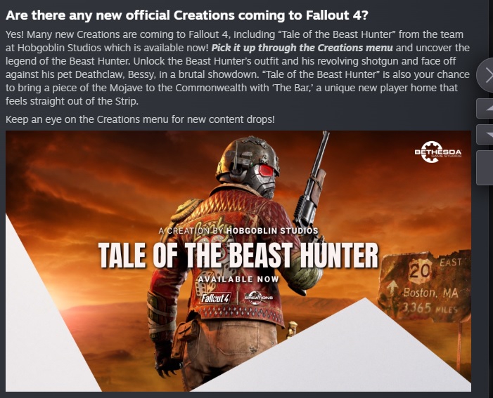 Creation Club был прекращен и заменен системой Creations с аналогичным названием и программой Verified Creator Program 10 ноября 2025 года, когда вышла Fallout 4: Anniversary Edition.