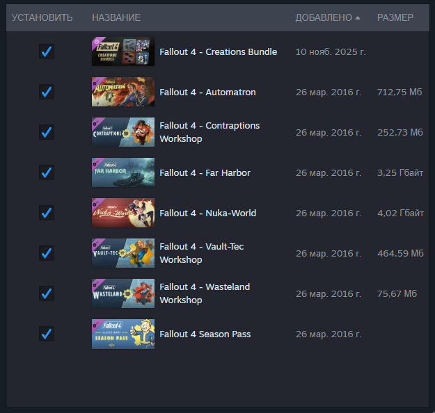 Anniversary Edition включает в себя базовую игру и шесть основных дополнений , включая Automatron , Far Harbor и Nuka-World , а также дополнения к Workshop: Wasteland Workshop , Contraptions Workshop и Vault-Tec Workshop . Кроме того, оно включает 150 элементов контента Creation Club , включая уже доступные, а также новый, ранее не выпущенный контент.