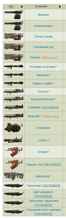 Оружие без отдельной модели, но с уникальными эффектами: Lorenzo's Artifact gun Zeta gun Nuka-Nuke Launcher (формально своя модель, но фактически там просто перекрашенный толстяк, изменения минимальны) 2076 World Series baseball bat (формально своя модель, фактически отличается только логотипом) December's Child Aeternus Automatic laser musket