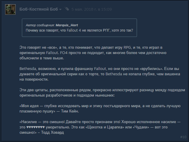 >Благо, что фоллаут 4 -- чистокровная рпг и тут есть много вариантов прохождения квестов Блять, скажите же что это пародия, я отказываюсь верить что такие люди существуют ИРЛ, это запрещают законы квантовой физики