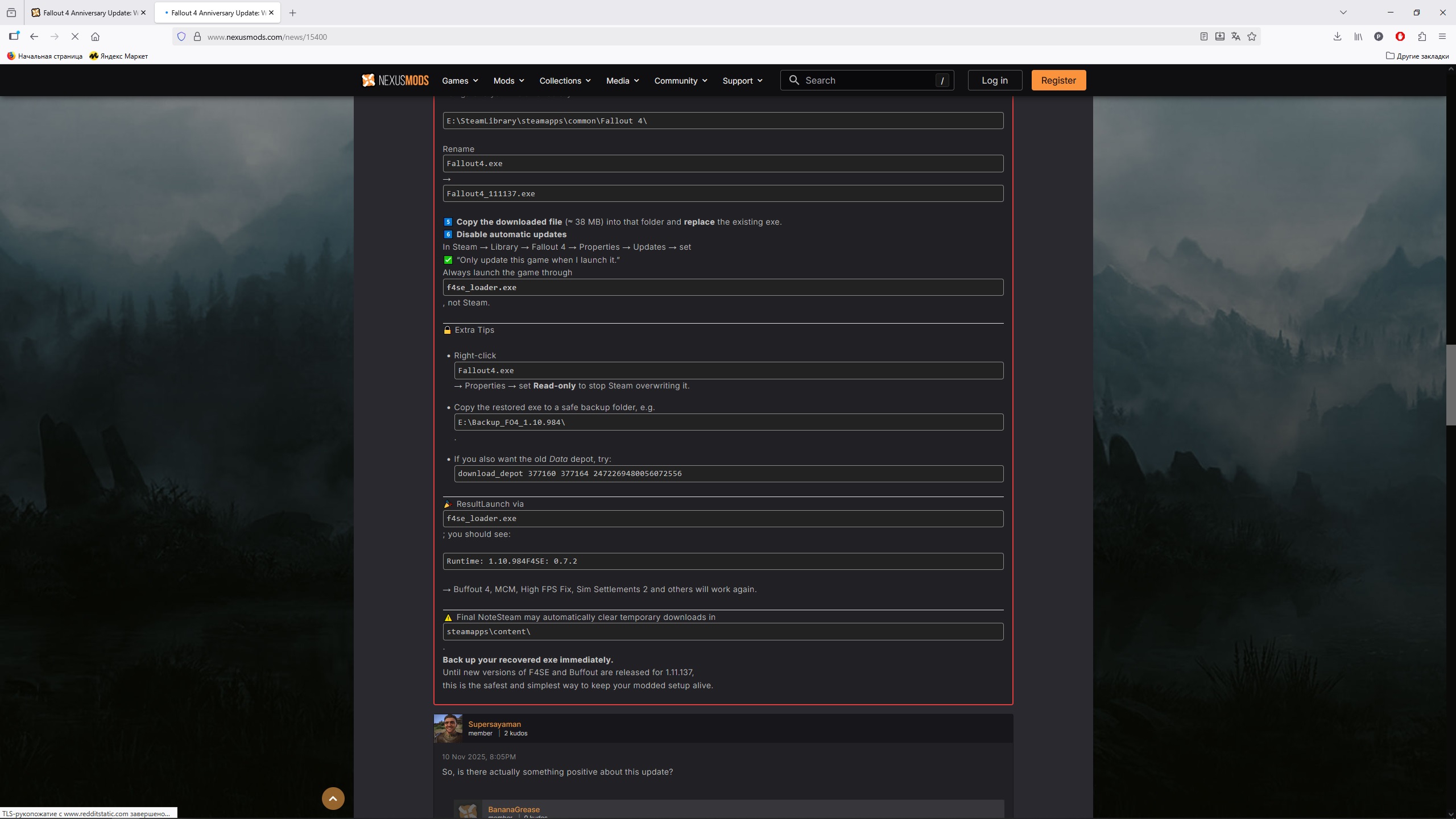 >>50430121 Чего ставить-то? Я отключил все васянки, обновился, запустился, Тодд предложил скочать купленный калтент, я скочал, игра перестала запускаться
