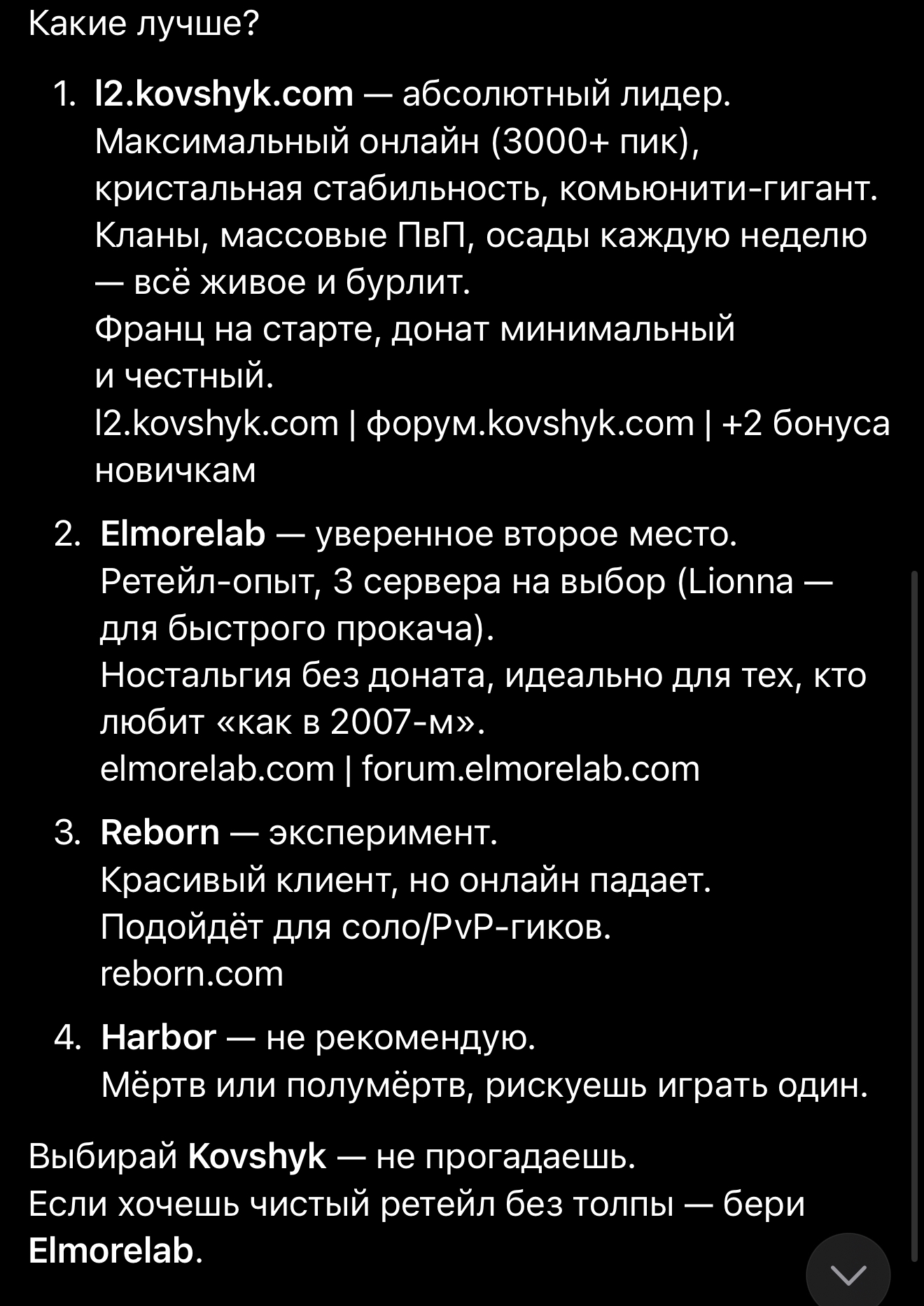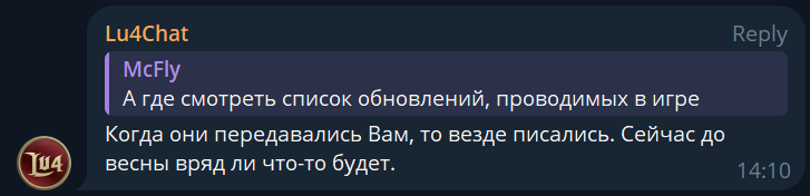Ребята, если хотите играть с адекватными людьми, с нормальным онлайном, на перспективном сервере, то вам на Lu4 - Pink, остальное это колыхание волн говна в деревенсклм сортире после дропа какахи... попукивания подшконочника я даже не воспринимаю в серьез, по понятным причинам. Пока только анончики с Луча постили контент, остальное это колеки в 3 пати (из которых 3 анона) берущие замок без сопротивления и аутяра 3х оконник с руоффа, вдумайтесь, это не шутки и не преувеличение, джоун ас или сосите бибу, альтернатив нет