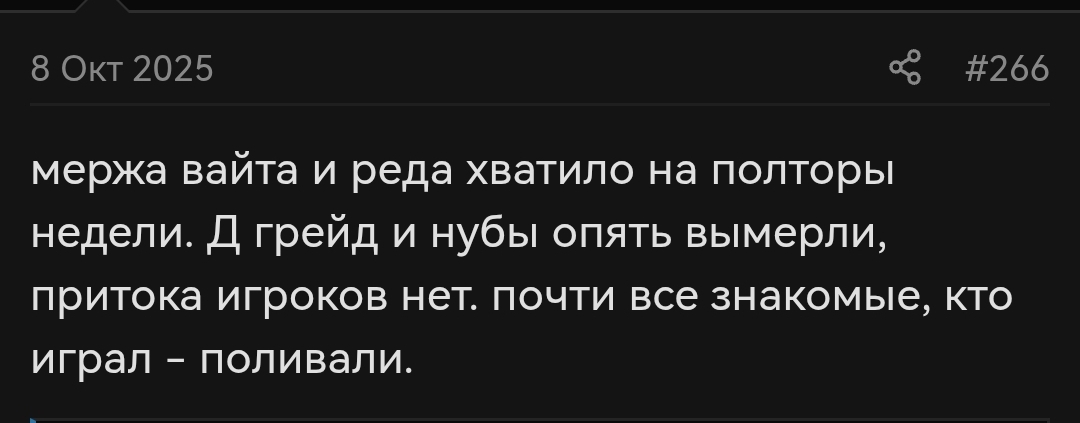 Закатился на самурая потамагочить в долгую, забайтило что 20 часов в сутки там пве, да и в пвп время никто не трогал, для тамагочера ваще кайфуха. Даже 5к залил на "пассы", на которые можно в месяц в сумме 10к потратить. Ну так вот, выяснил, что у фритуплейщика дофамина примерно 0, развития вообще никакого. У работяги, что на ступень выше фритуплейщика, весь дофамин - развитие раз в месяц за 10к лимит доната месячного, что тоже вообще не густо. Единственный кто получает удовольствие от развития - чел с большим кошельком, который может бесконечно вливать и буститься (нахуя? я не знаю, игра мертва давно). В общем-то это всё и так известно, но вот захотелось говнеца похавать, что поделать, да и интересно было посмотреть на изменения офовского эссенса спустя несколько лет. Вывод сделал, что на офе вообще нехуй делать работяге, за дофамином надо идти на эссенс фришки, но беда в том что они живут по паре месяцев. Ну, либо идти в мобилки, там разрабы щедры на дофамин для фритуплейщиков.