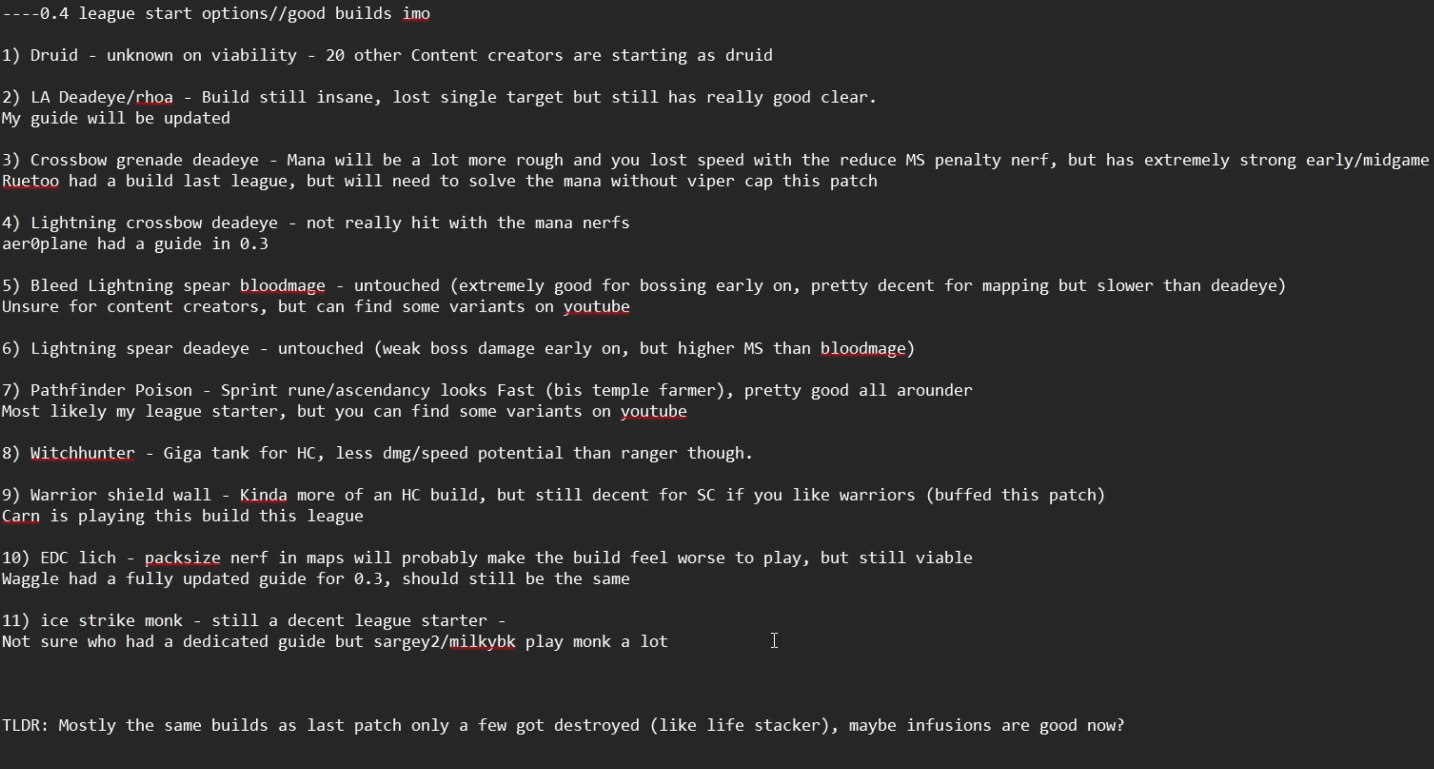 Есть какой-нить тир лист от авторитетных протыков касательно лига-стартеров в 0.4? В 0.1 играл на инферналисте, потом ролльнул арк сорку. 0.2 скипал. 0.3 бегал на дыдайке. Вот думаю на чем врываться в 0.4