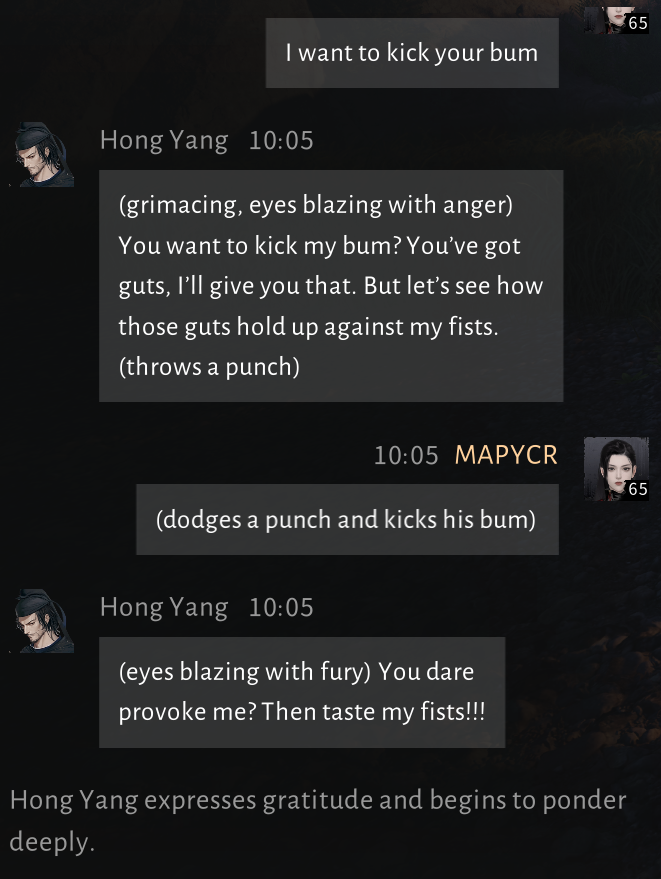 А ты че тут сидишь? Культивируешь что-ли? Так яж культиватор. Да ну? Ну да. И какой у тебя закон Дао? Высший закон парирования. Слыш, малец, не в масть тебе такой закон, перерождайся давай.