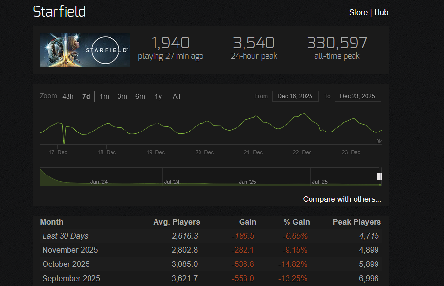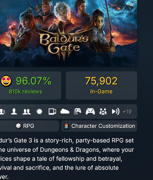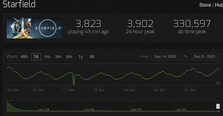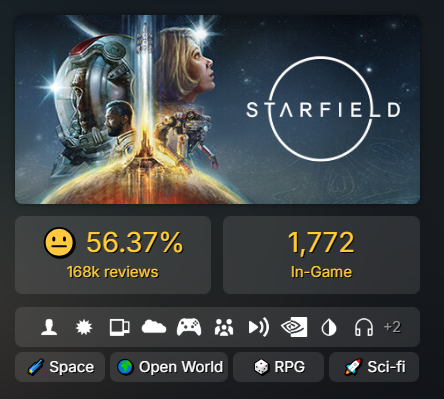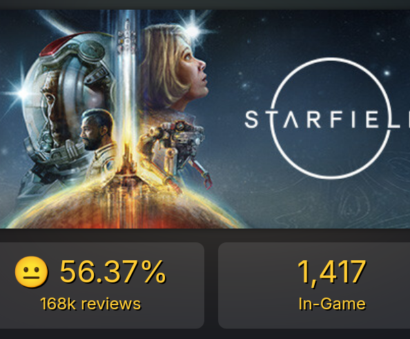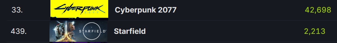 Чому так? > Продажи Baldur's Gate 3 превысили 20 миллионов копий > Starfield on reviews: 3.4m, on playtime: 2.4m, on rank: 784.6k, Copies sold: 2.9m (1.7m - 4.1m)