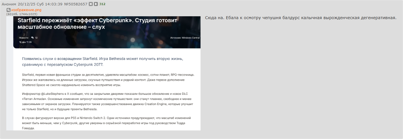 >Но если вот нужно за что-то обосрать старфилд Он уже в 2018 обосрался. Его не надо обсирать. И да, фанаты его душевно больные люди. Пытаются всех в почти 2026 году, уверить что там графика пиздец охуенная. Да и вообще вся игра охуенная. И как любой адекватный хуя блять двачер, обязан на место поставить шизов из секты тодда "мудак" говварда. Везде есть игры с косяками. И везде найдется кто то, кто будет говорить что она лучшая. Но не с пеной у рта. А фаны подделок тодда, будут прям рваться, доказывая что их дерьмо, самое дерьмовистое, ой лучшее.