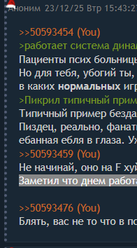 Чулочные страсти. Откуда оно в тред явилось-то? Это явно не наш вахтюшкин, потому что тот примитивный бибизян с боевыми картинками и парой фраз по скрипту. Здесь же чувствуется какое-то фанатичное отношение, будто в тред /b/ попал, где шизофреник со справкой доказывает свои привилегии.