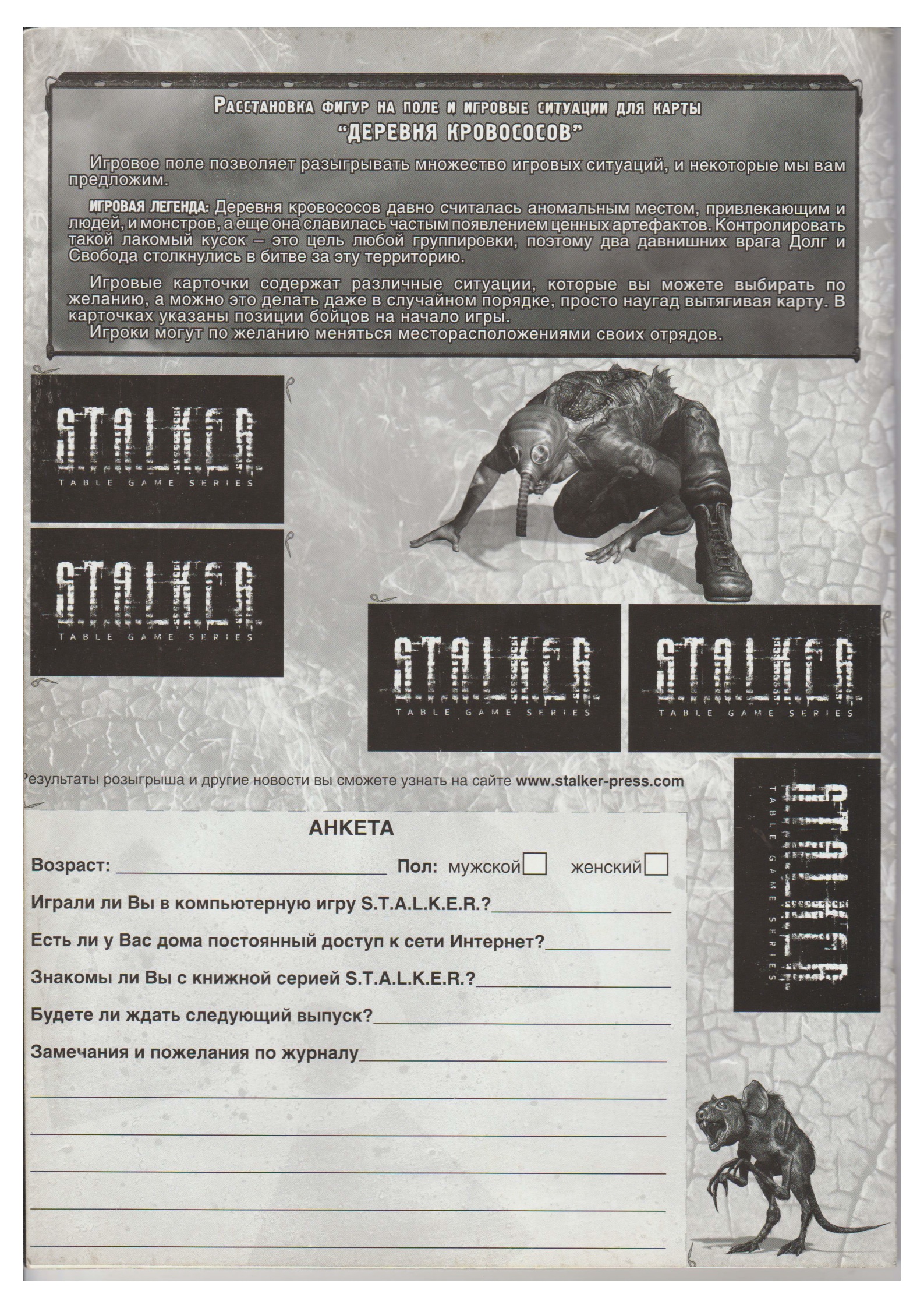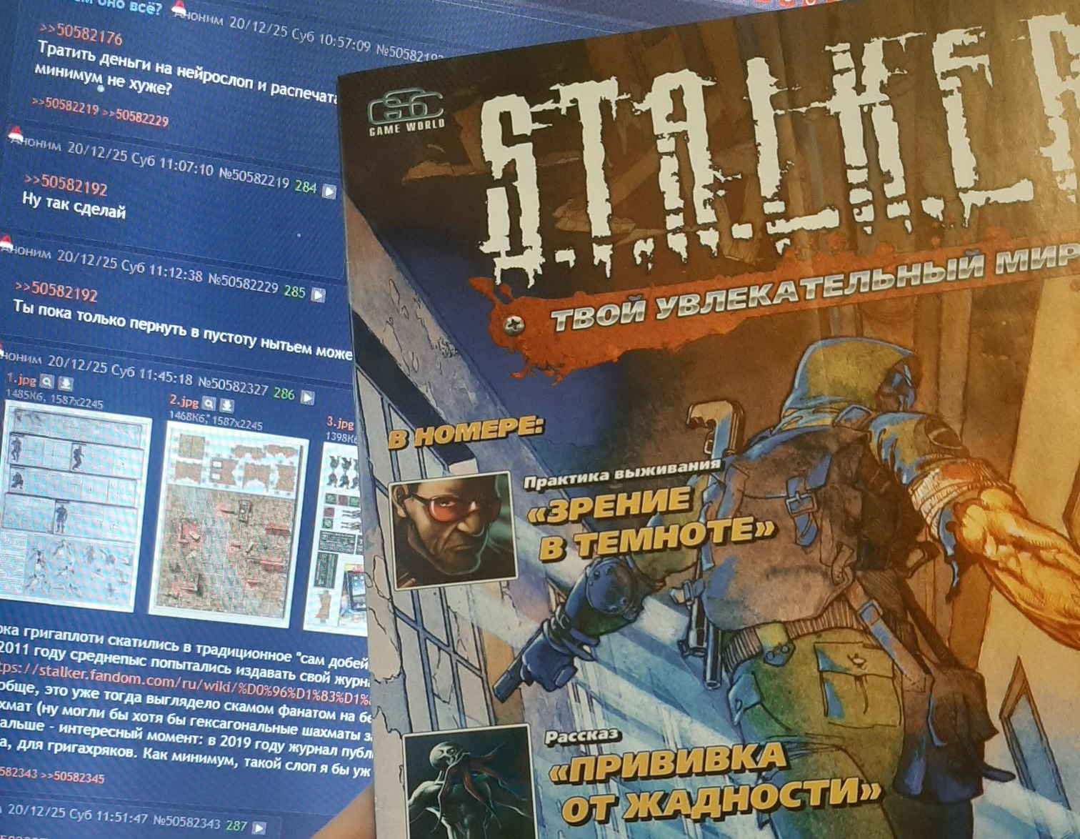 Пока григаплоти скатились в традиционное "сам добейся", я таки нашел в закромах первоисточник. В 2011 году среднепыс попытались издавать свой журнал, но все закончилось на одном-единственном номере: https://stalker.fandom.com/ru/wiki/%D0%96%D1%83%D1%80%D0%BD%D0%B0%D0%BB_S.T.A.L.K.E.R. Вообще, это уже тогда выглядело скамом фанатом на бесплатную лотерею по розыгрышу Айпада, а сама настолка - слопом шахмат (ну могли бы хотя бы гексагональные шахматы за образец взять). А дальше - интересный момент: в 2019 году журнал публикуют, но без страниц по настолке. Казалось бы - почему? Лол. И да, для григахряков. Как минимум, такой слоп я бы уж постыдился делать.