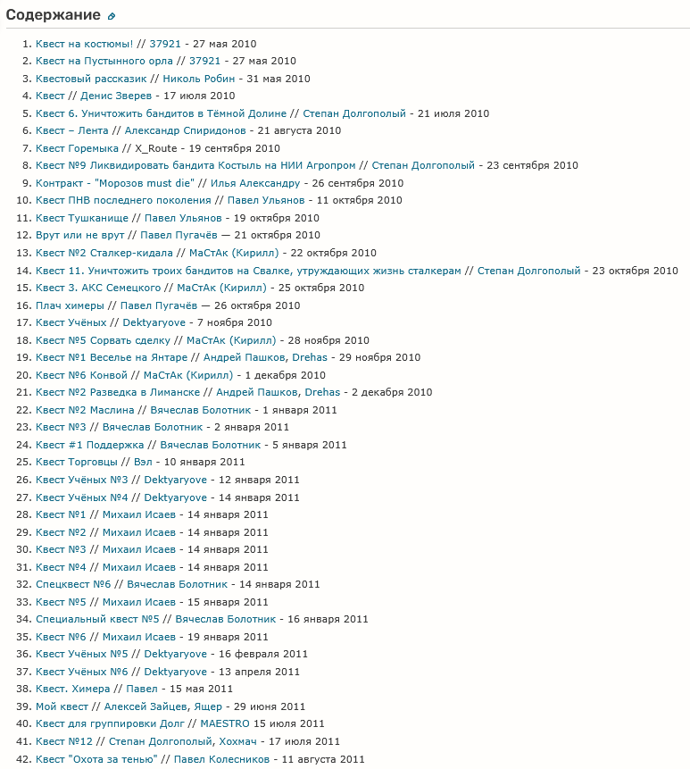 1. История Трависа. Эпизод 1 2. Горизонт Событий 3. Тёмная сторона Кордона 4. Судьба Монолита REBUILD: Эксперименты 5. История Трависа. Эпизод 2 6. Извозчик 7. Hibernation Evil - Эпизод 5 8. История Лапсердака 9. Folk Solyanka 10. SFZ Project Episode Zero. DELUXE REMAKE 11. Чужой среди чужих: Последний Архитектор 12. Новое время (OGSR Update) 13. Сумерки Зоны: Дух 14. Назад в прошлое 15. Зона молчания 16. Судьба Монолита REBUILD: Самокопание 17. Грань. Эпизод 1 18. Исповедь выжившего 19. Охотник за артефактами 20. Контракт 21. Расплата 22. Смутные Времена 23. Пробуждение. 2055 (Бета) 24. К Элизе 25. Город гиблых слёз: Зарождение 26. Космическая угроза 27. Чужой среди чужих: DELUXE 28. RESURRECTED MP 29. Закон Шляпки 30. История Путника: Загадка Чёрного озера