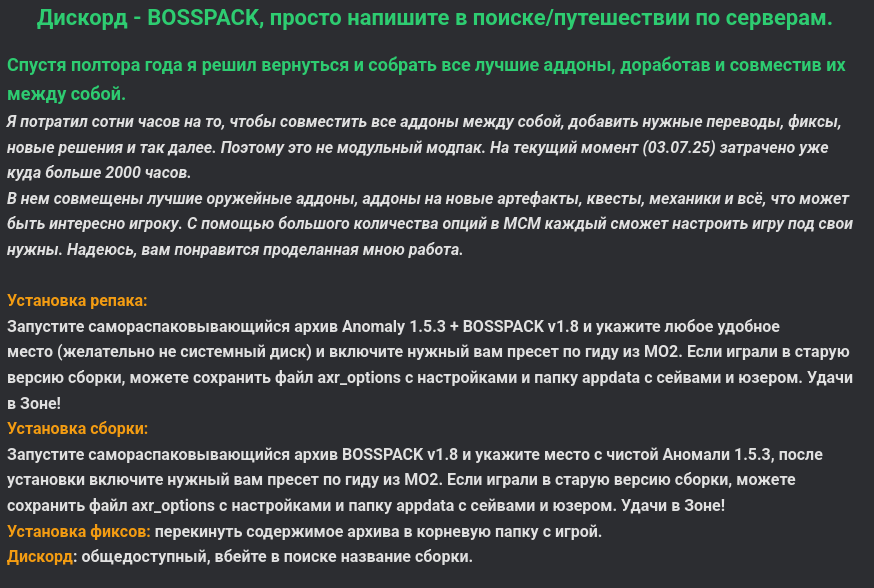 Да и в целом мод говно ебаное для пропитых скуфариков. Графика блевотина вырвиглазная. Баланса нет нихуя, топ лут фармится на первой локации спавна, некоротые нпс просто непробиваемые. Настройки кривая хуета, звук в наушниках отъебывается, клавиши не переназначаются из-за несбрасываемых привязок на те же клавиши. Музыка на базах ебет уши, из каждого утюга разная музыка херачит и не убавляется через настройки. На локации стоит один гул, пердеж и ор, заебало эту говноеблю слушать на 30 минуте.