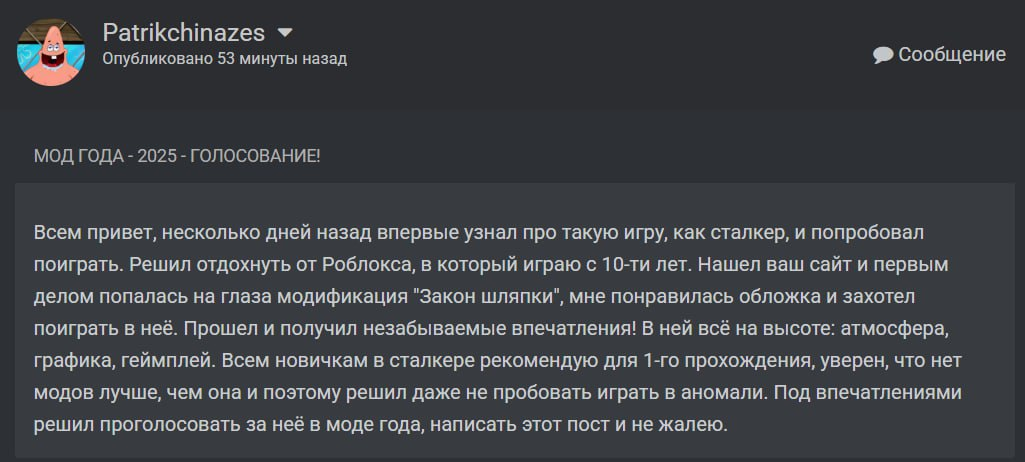 Надо на причастие идти в нормальные игры типа сталкер 2 или олр 3.0. За столько лет сранькера 1 выпустили только пару нормальных модов, остальное кал невероятный.