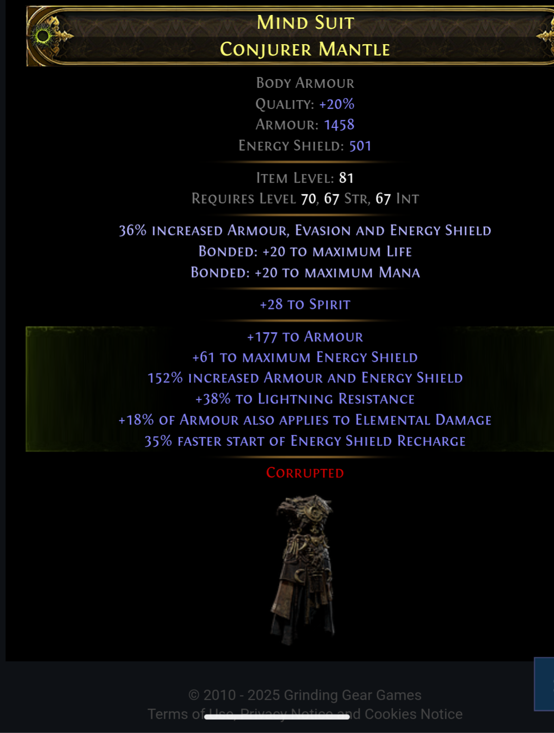 Лан, ближе к делу. Спиздил пикрелейтед заготовку с трейда за 7 див и фрактурнул спеллы с первого раза повезло? повезло. Дальше въебал 12 див в хаосспам на т1 спирит (спросоня рерольнул разок). Что дальше? Рандомный суффикс -> global defences. 3 \ 6 получается. Вопрос, куда кидаем десекрейт? Пока по прикидкам - в ластовый префикс. Суффиксы пытаемся заполнить резистами. Пытаться ли ловить кастспид?