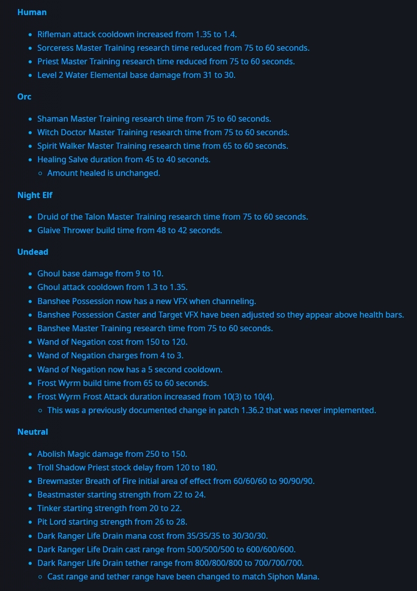 Если написать хуйни, то неравнодушные тут же ответят и пояснят, как правильно, так что пишем: >нерфы скоростей Скрытый баф эльфов, они ничего не потеряли >Militia duration increased from 40 to 42.5 seconds. Надо 45, какая-то полумера >Bash Bonus Damage increased from 25 to 25/50/75. Имба, будет 3 левел баша браться на 5 левеле мк. Много дамаги бесплатно. >Devotion Aura increased from 2/3.5/5 to 3/6/9. Тут без хуйни - имбища. >Druid of the talon cost increased from 135 to 145. Не самая популярная стратка, хз зачем нерф. >Immolation За любой нерф >Warden Против любого бафа >Spiked Carapace Похуй, просто не бьём кла или бьём аккуратно >некры Наверняка нарисуется тайминг, когда это имба, но в целом похуй, фриэкспа. >Nerubian Tower cooldown increased from 1 to 1.5. Нерф любителей микрить, гуд >Bladestorm damage increased from 110 damage per second to 160 damage per second Как будто будет прям карать лоулимит и строения, имба. >Spirit Walker Ну мб и стоило их вернуть в мету >Upgrade Lumber Increment Reduced Орки хуже всего рубят лес. Окейно. >Circlet item Просто отъебитесь от цирклетки уже >Tome of Retraining now has a stock of 2 charges in the shop. Похуй >Rusty Mining Pick Имба, баш на дх/блейде или многих ренджевиках даже в 15% в разы круче, чем у мк. Жду фл мету, он, емнип, круче всех ебашит из ренджевиков и сопоставимо с дх.