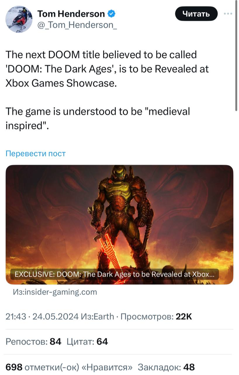 >>48384174 Ожидается, что DOOM: The Dark Ages представят на Xbox Games Showcase 2024. Впервые об игре узнали летом 2023 года, когда в документах нашли название DOOM: Year Zero.