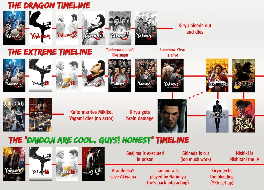 Есть дилогия Judgment, где события происходят в той же вселенной, есть отсылки к событиям в якудзах, в Lost Judgment вообще показаны некоторые последствия того что произошло в 7 LaD, да и в Gaiden можно встретить персонажа из Judgment. Если ещё их добавим то получается: 0>Kiwami>Kiwami>2>3>4>5>6>Judgment>7 Like a Dragon>Lost Judgment>Gaiden>8 Infinite Wealth>Pirate in Hawaii
