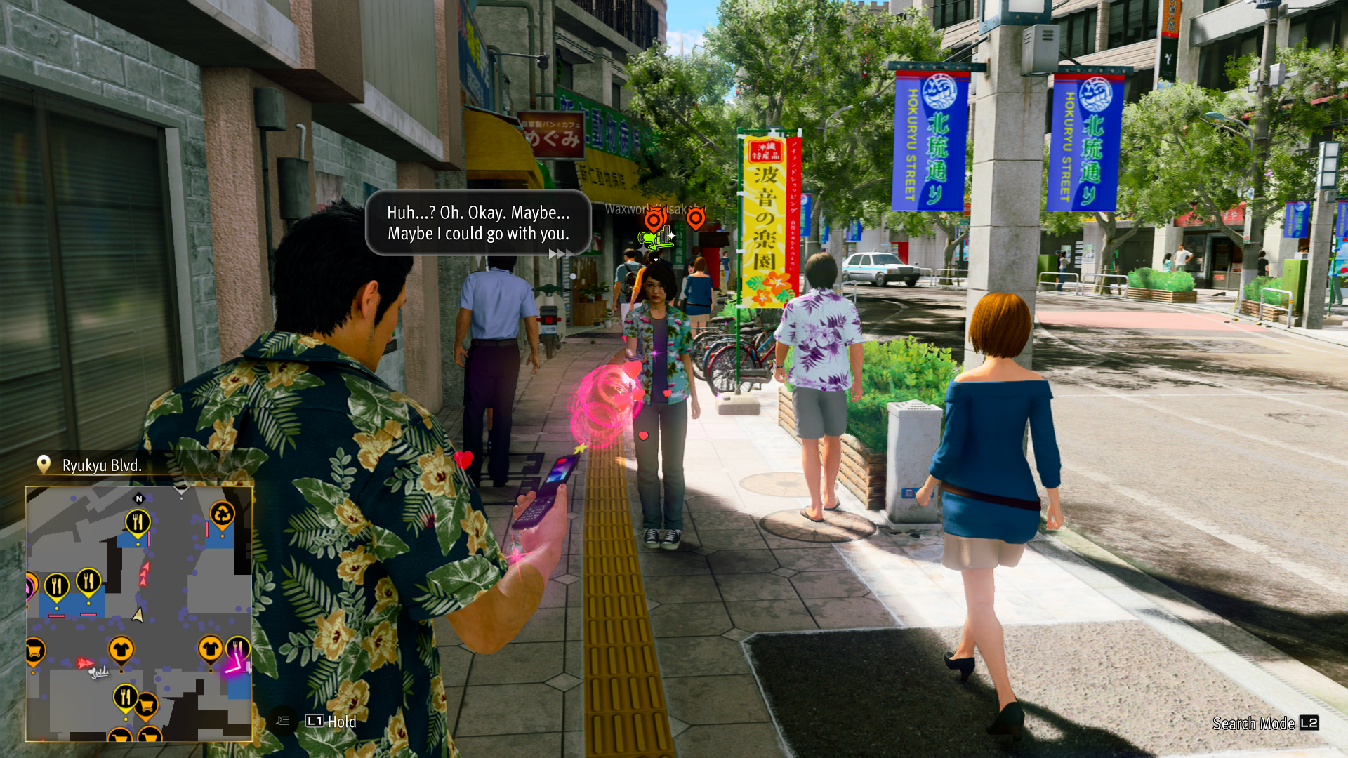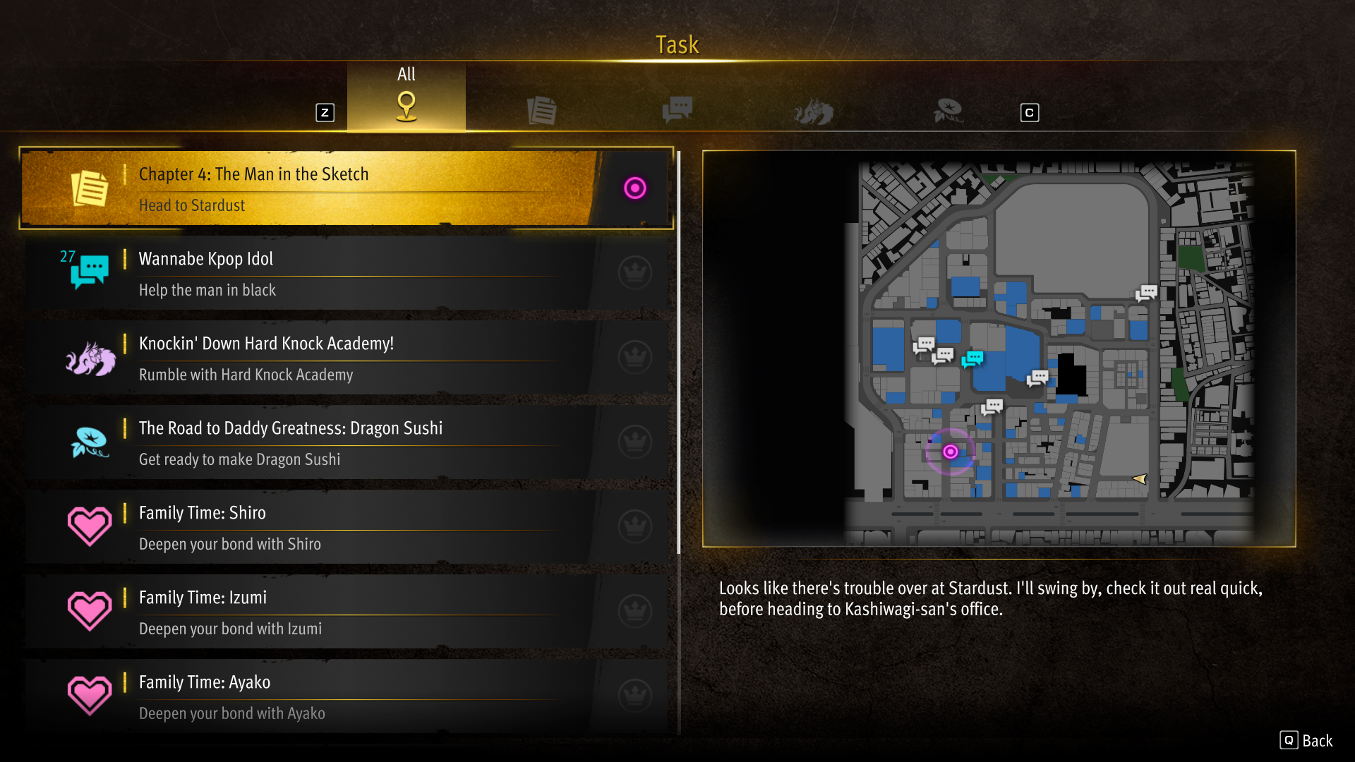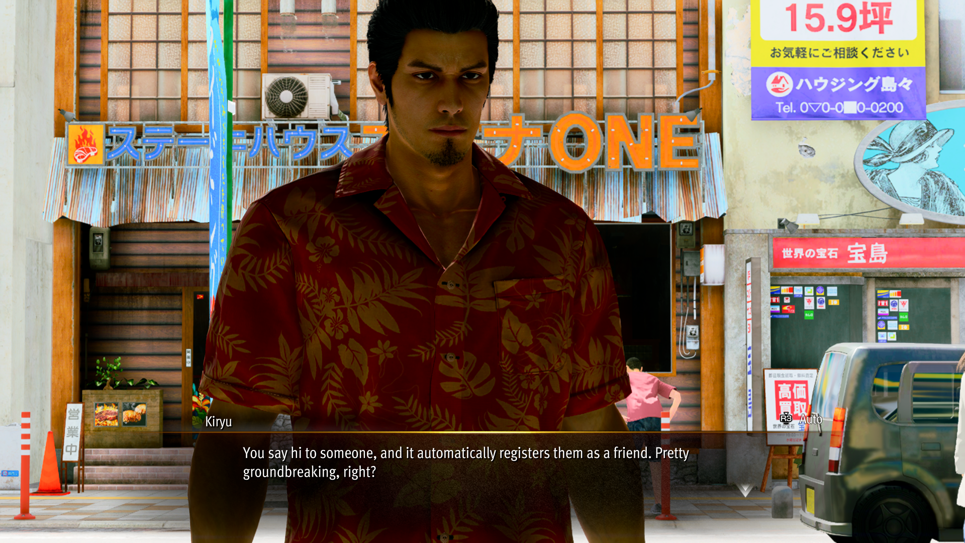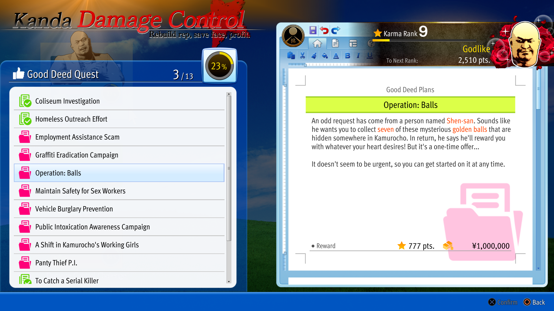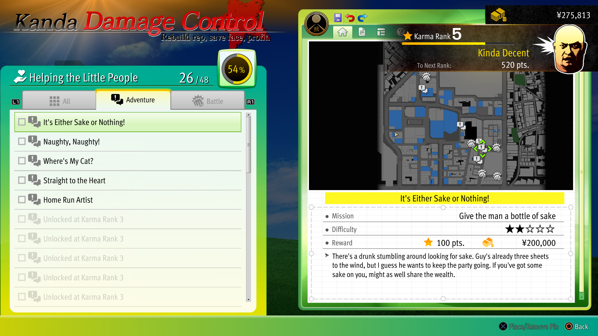 Ну что, зачистка из Gaiden вернулась, выиграть для девочки котика в ufo catcher, поиграть в маджонг (слава богу просто поиграть а не выиграть), в бильярде пройти трикшоты на нормале, принести кому-то сэндвич, чипсы, сакэ, набор суши, водички, так что закупаемся всем что есть во всех комбини. И конечно же опиздюлить кого-нибудь, за выполнение дают много бабла, даже с одного уличного врага минимум 6000¥ выпадает, но и апгрейды теперь дорогие покупаются только за деньги. А вот кастомизации телефона нет как и экипировки так что тут без небольших баффов в драках. Completion list есть но он идёт в зачёт поднятия ранга Канды, в караоке только Baka Mitai, можно позвать Канду но он сам петь не будет.