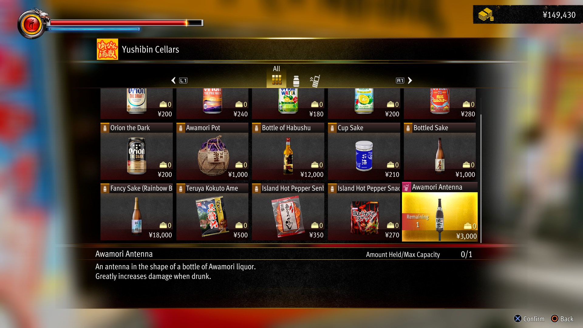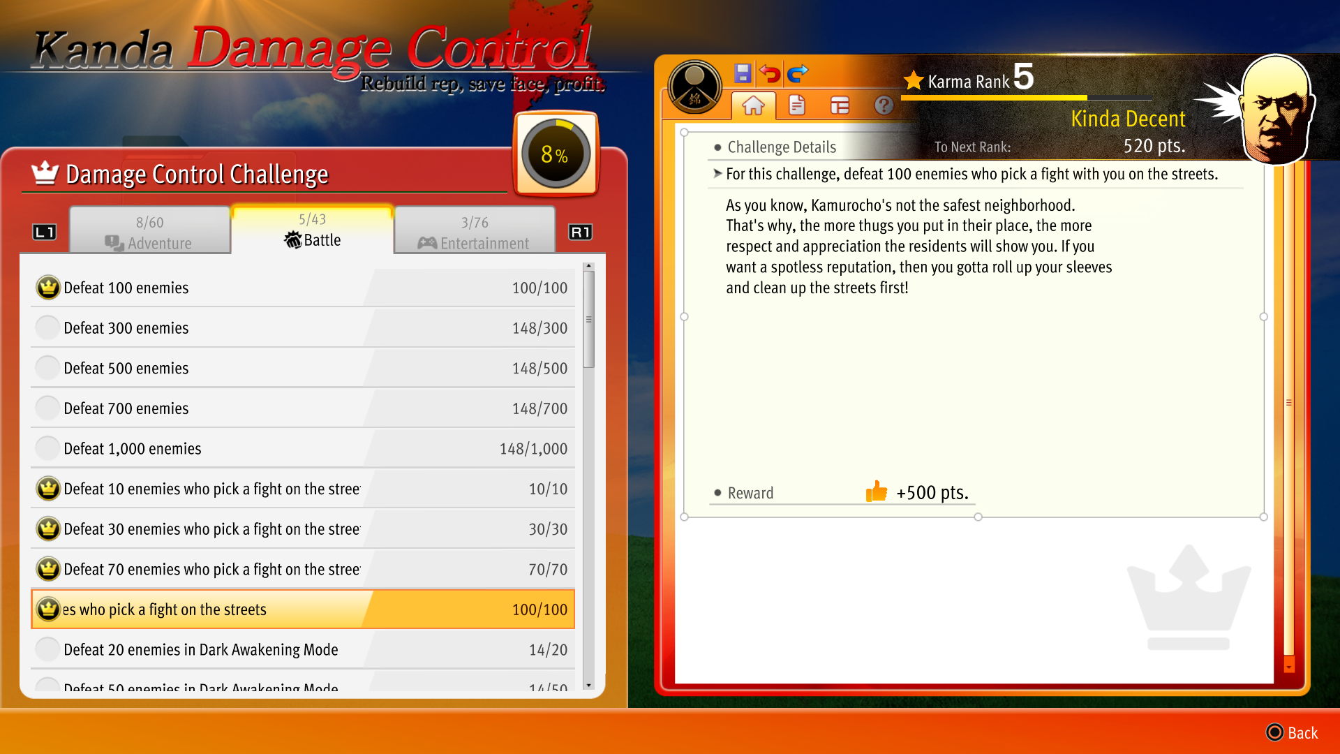 С прокачкой дела такие, первые пять абилок за деньги, остальное исключительно за очки, которые дают за каждый пердёж, completion list короче. А вот статы только за деньги, есть только атака и здоровье, 5 уровней по 4 прокачки в каждом, в первом по 6000¥, потом 30000¥, 100000¥, дальше пока не видел. И всё, никакой экипировки, больше никаких золотых трусов +2000 к атаке и +4000 к защите. Странно что в прокачку они запихали даже возможность пнуть врага с разбегу как мяч, или например heat-добивание когда чел лежит, его тоже надо покупать, и оно делается только в стиле Рюкю щитом по ебалу. Появились криты, если долбить в спину или увернуться в последний момент то следующая плюха нанесёт урона побольше, есть ещё какие-то условия. Как я заметил иногда враги тут умеют блокировать, нет, не блокудза лол, у Рюкю на отдельную кнопку есть комбо для пробивания блоков.
