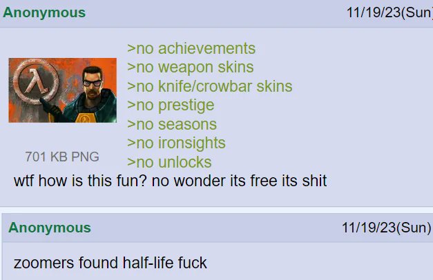 >>50240909 Вот что Голдсорс животворящий делает! Ну и одуревшие от хопиума, голодные до любых новостей халферы, конечно. А самое страшное, что прошло уже семь лет.