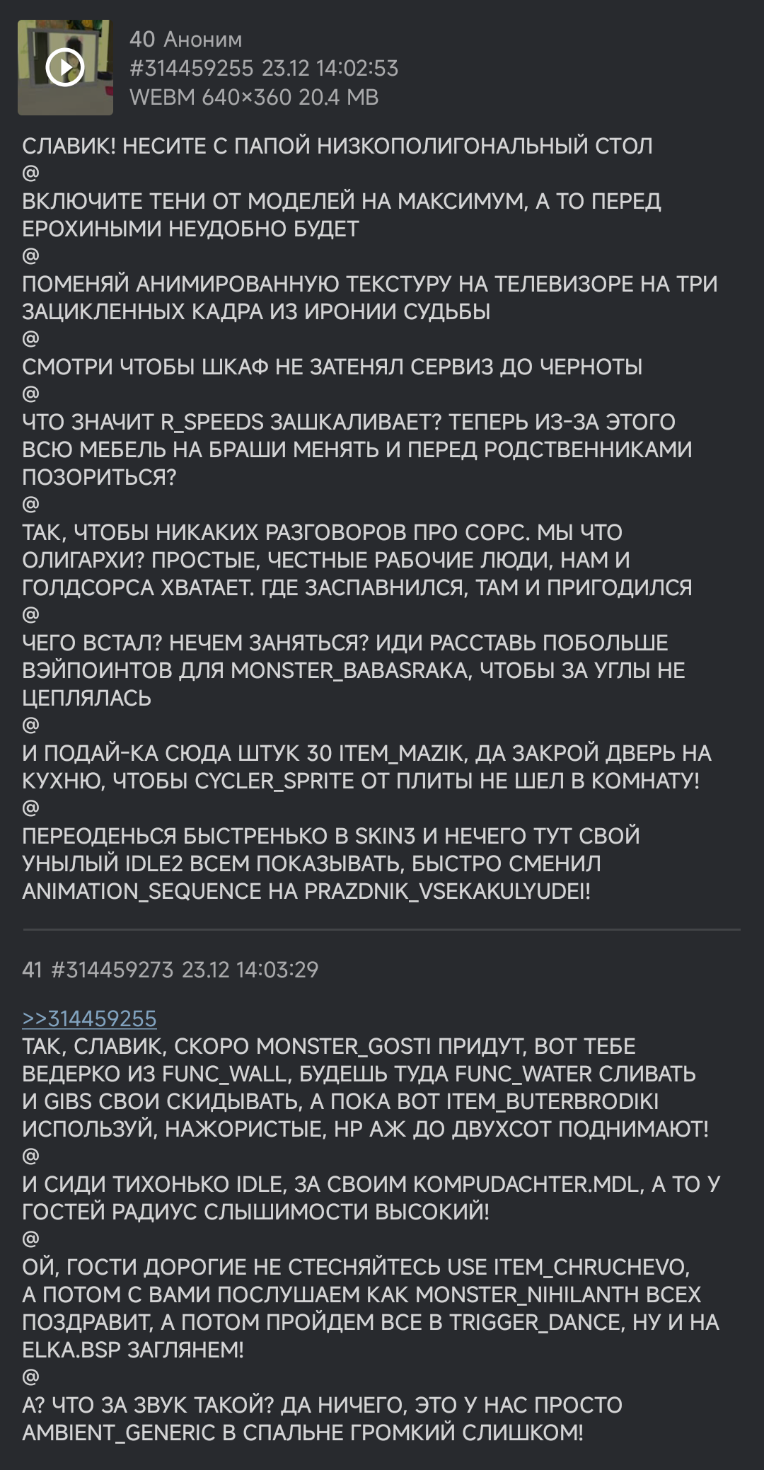 >>50066253 >еще эти вставки сценок из Гмода ТЮЮЮ1 Во напомнил. Пишаня давным давно говорил про них, когда только-только создал дискорд свой. Цимес в том был, что ему сложно их делать. Особенно смешно это вспоминать с учётом его современных стримовских высеров про неистовую ёбку ВР параши для сериала по ГО.