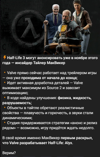 Внезапно пришла в голову мысль, что если Half-Life 3 и выйдет, то она будет задействовать возможности генеративных нейросетей. Если каждая новая халфа "должна" быть революционой, то вот та самая революция, которую все ждут уже 17 год. Валв уже и раньше пыталась отойти от скриптов - вспомните Режиссера из лефки, и в одной из итераций HL3 планировали что-то подобное. Так что на мой взгляд это единственная стоящая новая технология, которую на полную смогут раскрутить вентили, ибо VR судя по всему уже ВСЕ. Скорее всего уже в этом году появятся первые игры, попытающиеся сделать подобное, но кому как не Valve сделать бенчмарк новых нейронок! Что думаете, аноны?