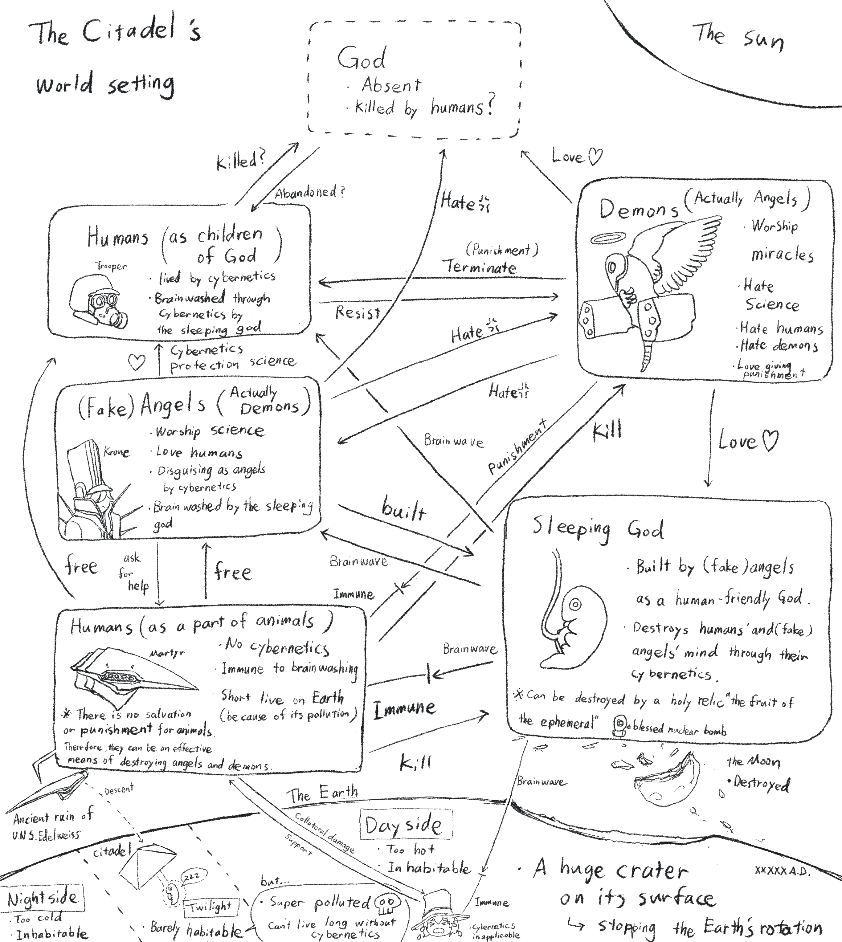 То есть был бог, который умер, Ангелы начали убивать людей, а Демоны за них впряглись, даровав технологии. В итоге создали несколько городов, и Спящего Бога, который начал корраптить людей и Демонов, при этом Ангелы оставили людей в покое, в итоге мы в первой части убиваем спящего бога с помощью созданной Мученицы...