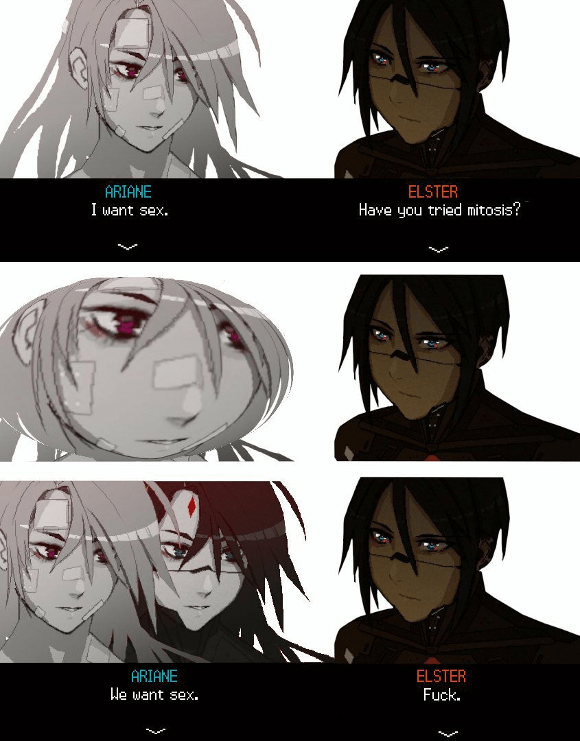 Всё это сон арианы, или она отправила сигнал на ленг? Мы играем за другую эльстер, которая реально ищет своего гештальта напарника, или это ариана проецирует свою ситуацию? Кто сидит за камерами ариана или фальке? Столько вопросов, просто пизда.