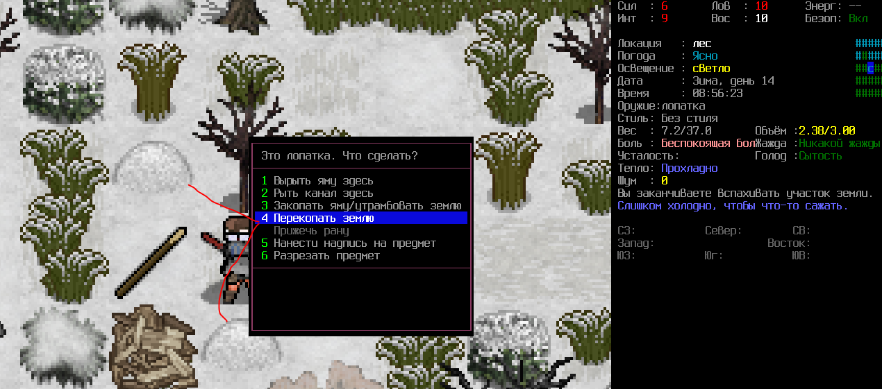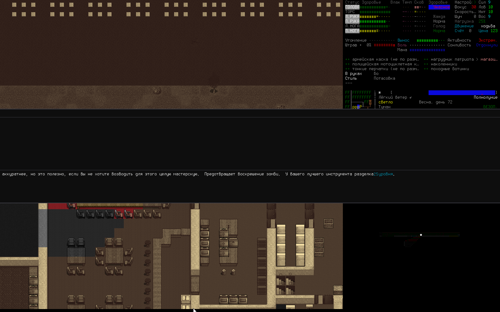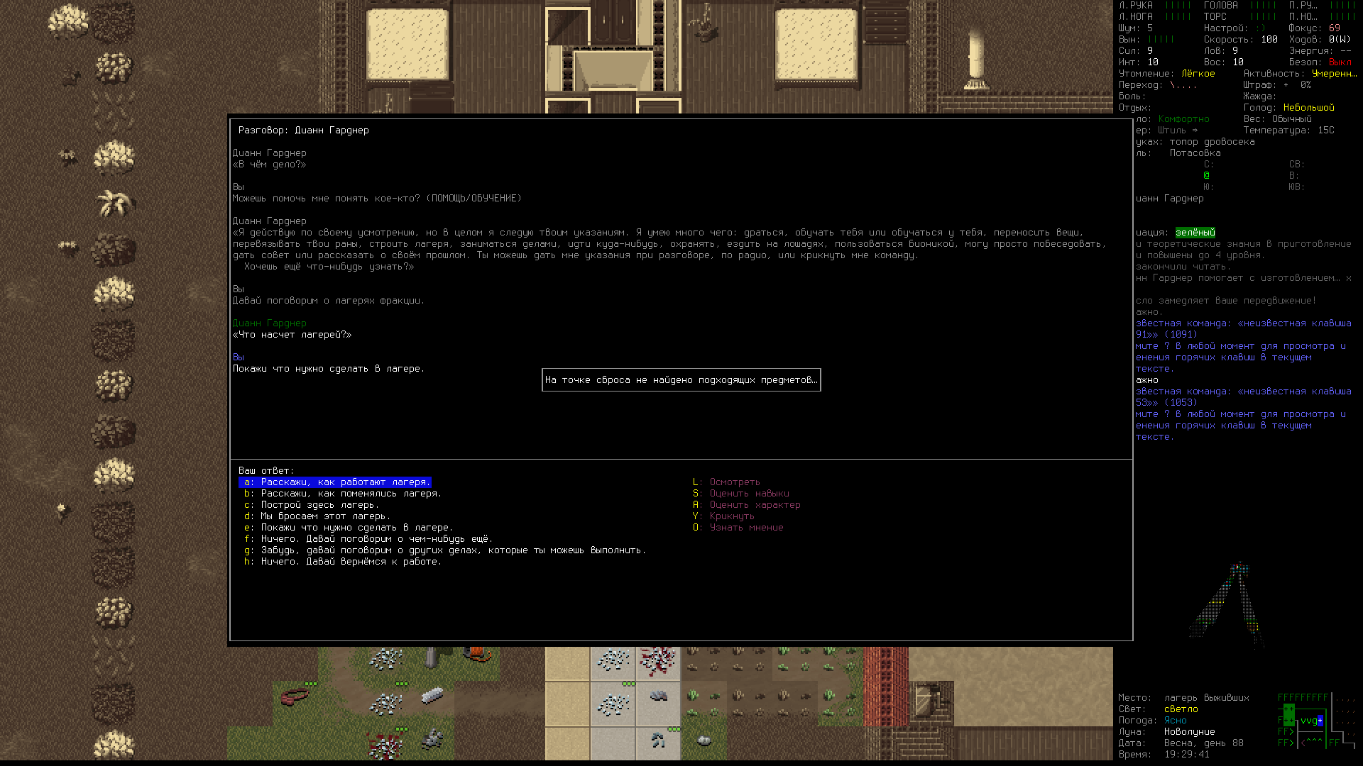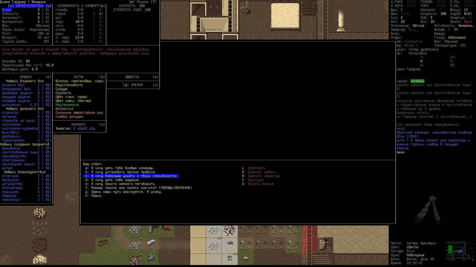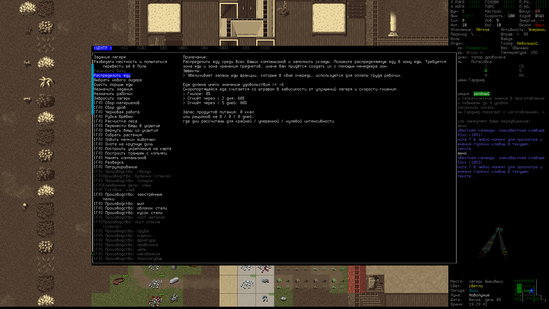 Платиновые вопросы • Не заходил в игру X лет, что изменилось? Ссылки на чейнджлоги выше. • А как...? Любой вопрос по управлению: нажать Esc, далее выбрать "Сочетания клавиш" и найти нужный хоткей. Если вопрос более сложный, нажать Esc/Помощь или ? и внимательно всё просмотреть. • Есть смысл играть в экспериментальную версию или на последней стабильной будет норм? В BN стабильные версии выходят часто и регулярно, так что смысл есть. В DDA стабильные выходят редко и быстро становятся говном мамонта. • Разморозить еду или воду: активировать кастрюлю/сковородку рядом с источником огня. • Поднять часть предметов из кучи: выбрать предмет, набрать цифрами необходимое количество и нажать стрелку вправо. • В окне создания мира вкладки переключаются кнопками < и > с шифтом в английской раскладке, вкладки модов переключаются Tab и Shift+Tab.