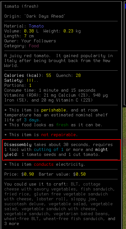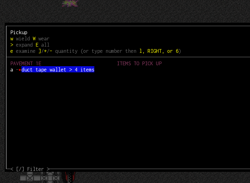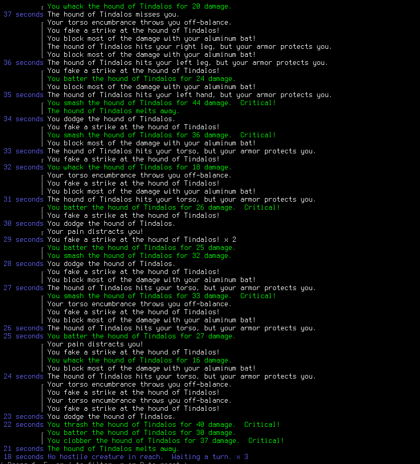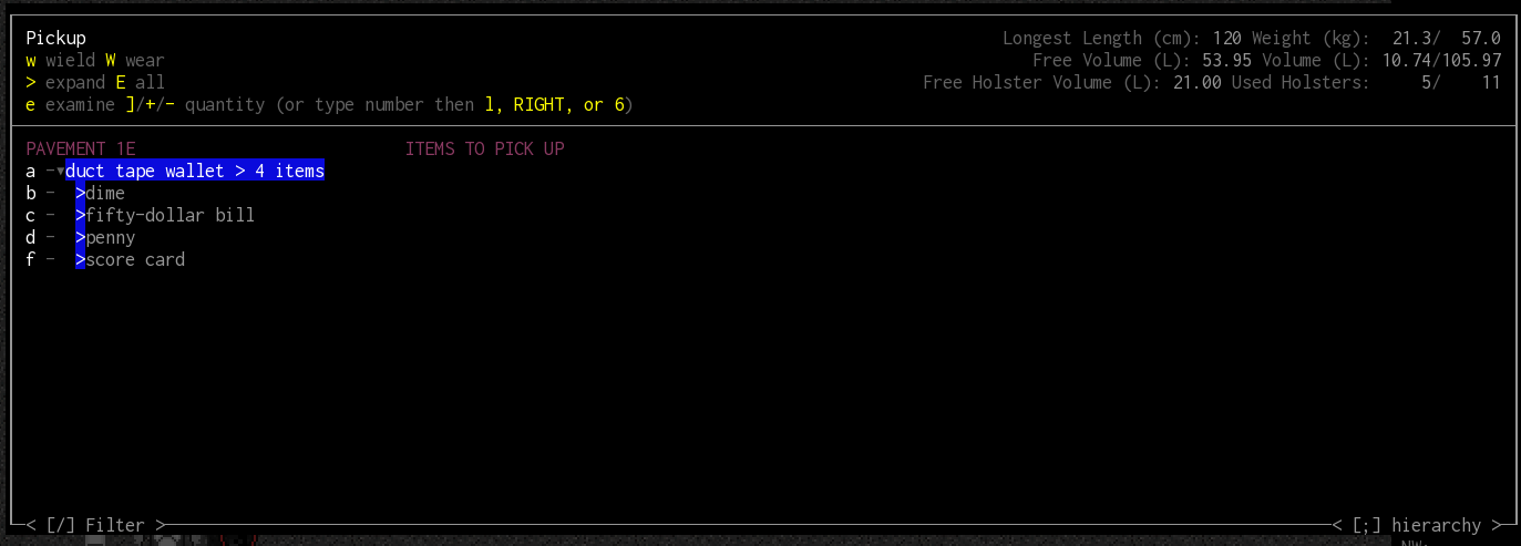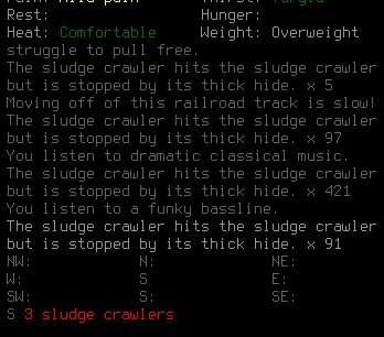DDA более популярен у масс, темп разработки у него выше. За долгое время обзавелся отличными от BN фичами и контентом, а также своими минусами. Раздутость. Предметы без какого-либо применения ломятся из шкафов домов, валяются по углам улиц и набивают битком карманы НПС. Помимо этого в DDA есть система вариантов, когда один предмет может заспавниться с другим именем и описанием с единственной целью засрать интерфейс инвентаря. Тонны орехов, глоков, шапок и цветных презервативов давно стали мемами. Более функциональные вариации тоже имеются, например, марки стали. Пекиш. Пекиш в DDA это хаотичное желание жрать, после переделки системы голода одним из состояний индикатора был Peckish — слегка голоден; система работала криво, соответственно ощущениям руководителя проекта, персонаж был постоянно Hungry или Peckish, а также мог получить ожирение и похудеть обратно за считанные часы; словечко прижилось, и с тех пор ПЕКИШ символизирует собой и систему голода, и подход к разработке. Чейнджлог: https://github.com/CleverRaven/Cataclysm-DDA/raw/master/data/changelog.txt