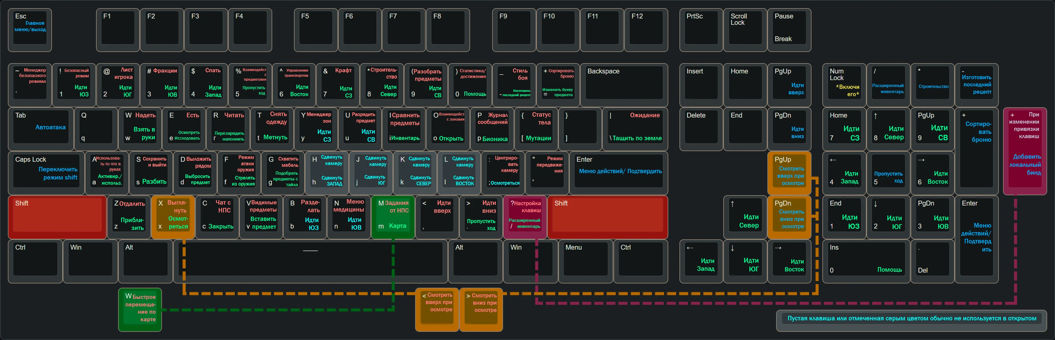 Если вы только начали своё путешествие в этом суровом постапокалиптическом мире, то наверняка столкнулись с весьма сложным управлением. Я проделал огромную работу по переводу всех действий на клавиатуре, чтобы сделать их более понятными и удобными для русскоязычных игроков.