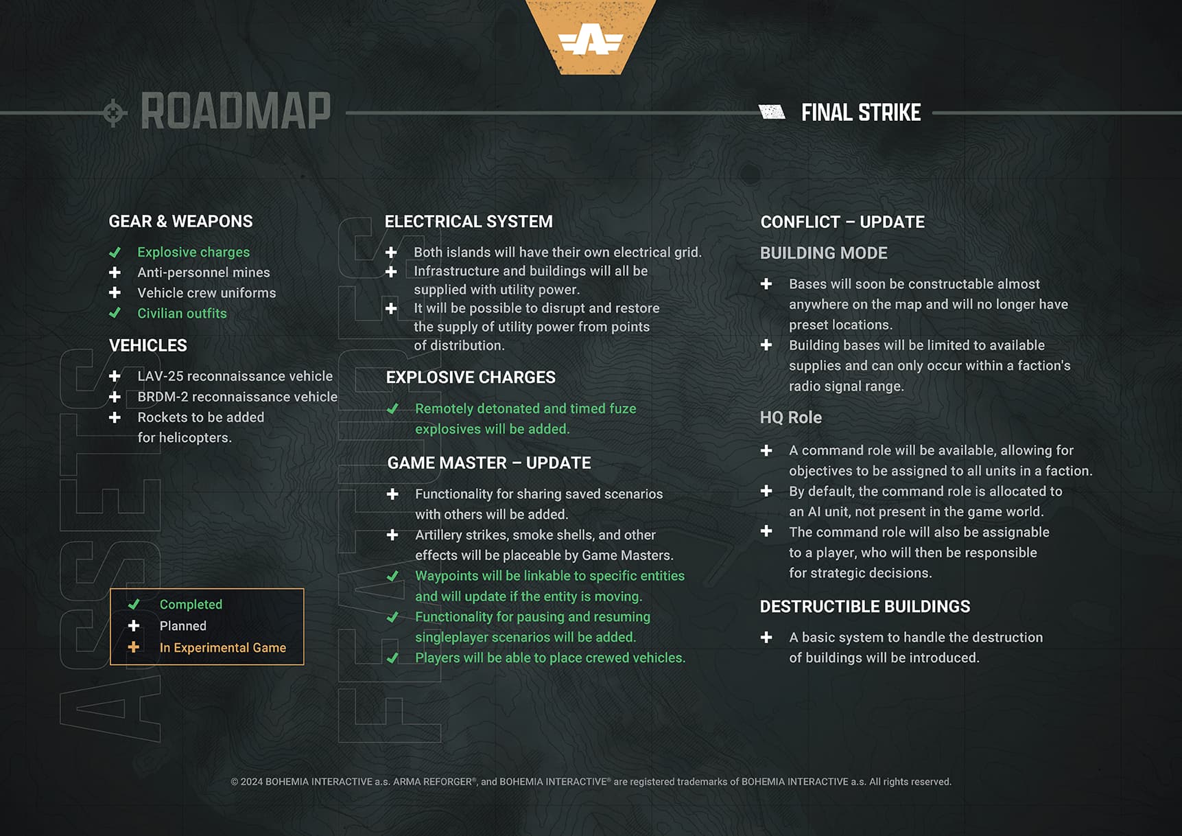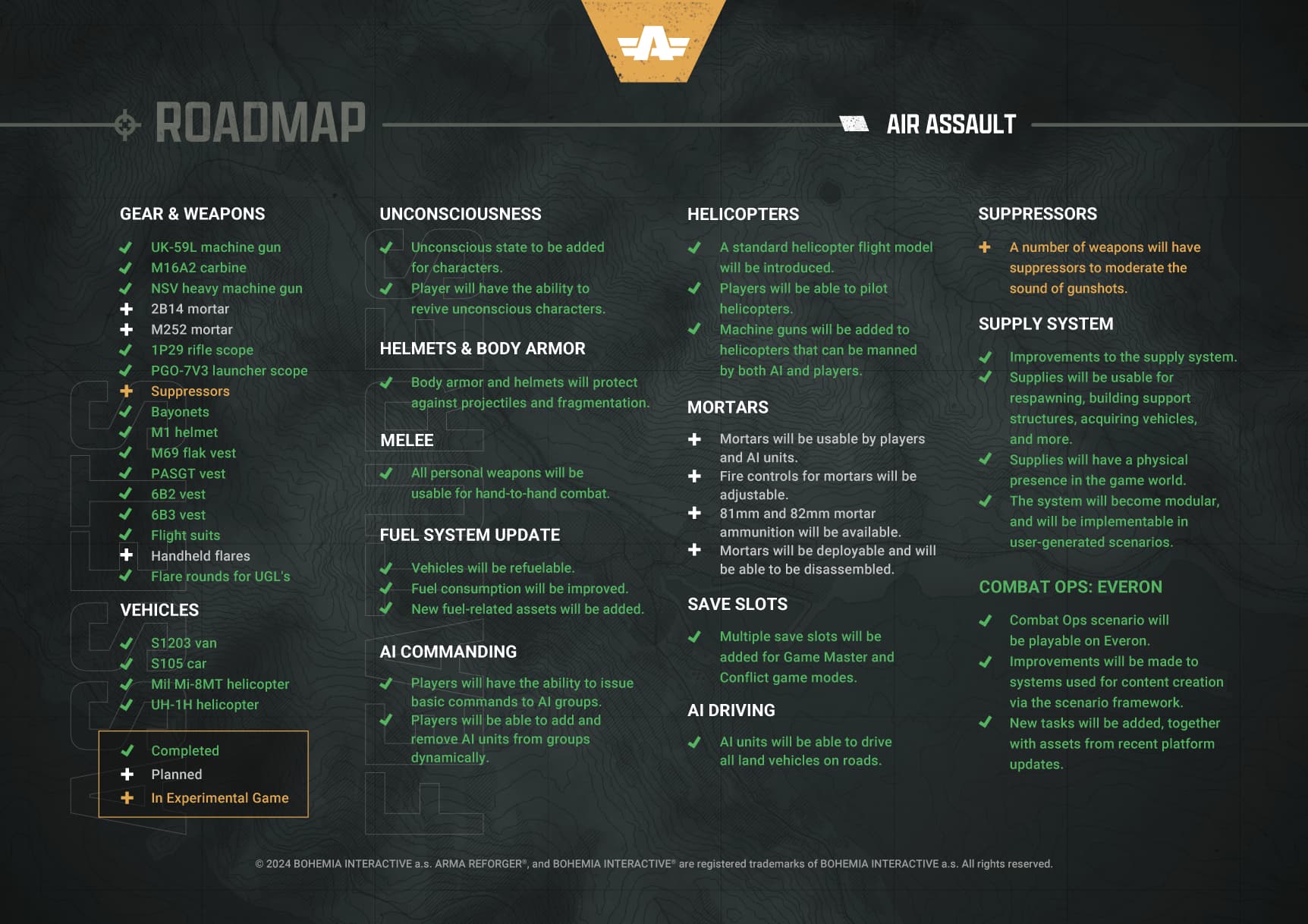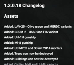 1. Коглуев 2. Перемещение в технике 3. Новое* РПГ + снаряды к ним + оружие + форма + фракция 4. Сбор оружия (сбор минометов) 5. Противопехотные мины 6. Создание баз (в конфликте) 7. Роли солдат 8. КУСТЫ БУДУТ РЕАГИРОВАТЬ НА ДВИЖЕНИЕ ПЕРСОНАЖЕЙ, КУСТОДРОЧЕРЫ СОСАТЬ 9. Ремонт техники?