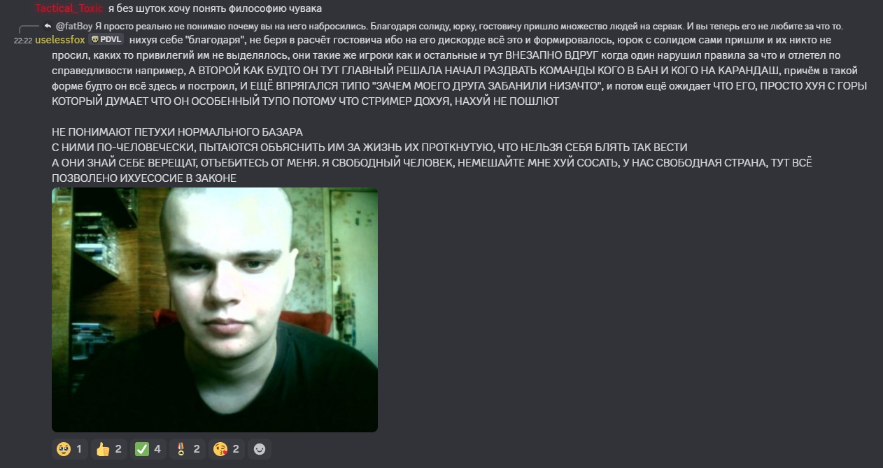 Хоxлы выпнули вдв ваtника и ваtник ушел к друзьям ватникам. У чела 150к подписчиков уже блять мог 3 своих сервера открыть и банить хоxлов по айпи по желанию.