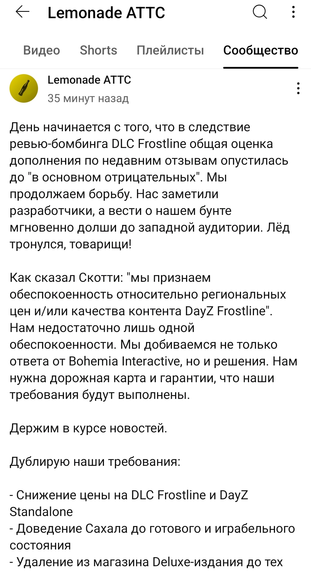 Анонче, если ты шаришь, дай пожалуйста знать. Есть ли сейчас возможность поиграть в ванильный дейз (игру или мод) на пиратке с такими же додиками (не залететь на сервер где одни про задроты)? Именно ванильный дейз на стандартной карте, из модов разве что спавн в желаемой локации или рядом с другом хотелось бы. Без магазинов, трейд зон, сейфспейсов, намальсков, квестов, ботов и прочего кала, а так, как изначально задумывал автор мода или игры. Такую в которой условный Абдуль маслят топором резал, а стримеры поадекватнее учили как технику чинить.