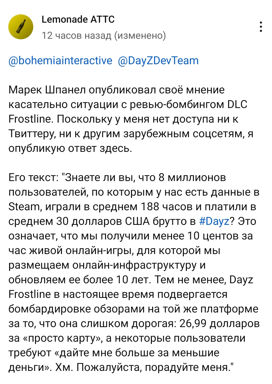 >>50242129 чел собрать лавэху с dayz 2 на обновленном движке святое дело для разрабов. Вроде были сливы что игра существует, но стойкое ощущение что чехи сели на зпху и не хотят работать. А если и сделают, то наверно к 30 нахуй году