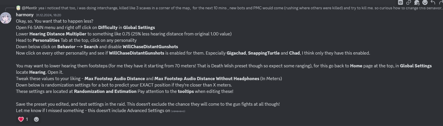 >>49448300 Если брать за эталон Лес/Тамогу то там вроде 14-16 чвк максимум может быть. +1-2 сверху если заспавнилось несколько больших групп. В файлах локации base.json путь SPT\SPT_DATA\Server\database\locations находишь параметр "MaxPlayers" (Это Чвк) и срезаешь его на удобное тебе количество в зависимости от локации. Скавов не помню как править, далеко от компа нахожусь. Ещё можно срезать глобальное количество населения (и Скавов и Чвк) в файле globals.json по адресу SPT\SPT_DATA\Server\database, ищи параметр WAVE_COEFF и от зависимости на какой настройке заселенности этого конкретного рейда ты сейчас играешь там ты сможешь настроить количество ботов от 0.1 (где на лодке будешь ты и рандомный Вася Пупкин) до 10 (Пресет Орда в настройке численность ботов в рейде)