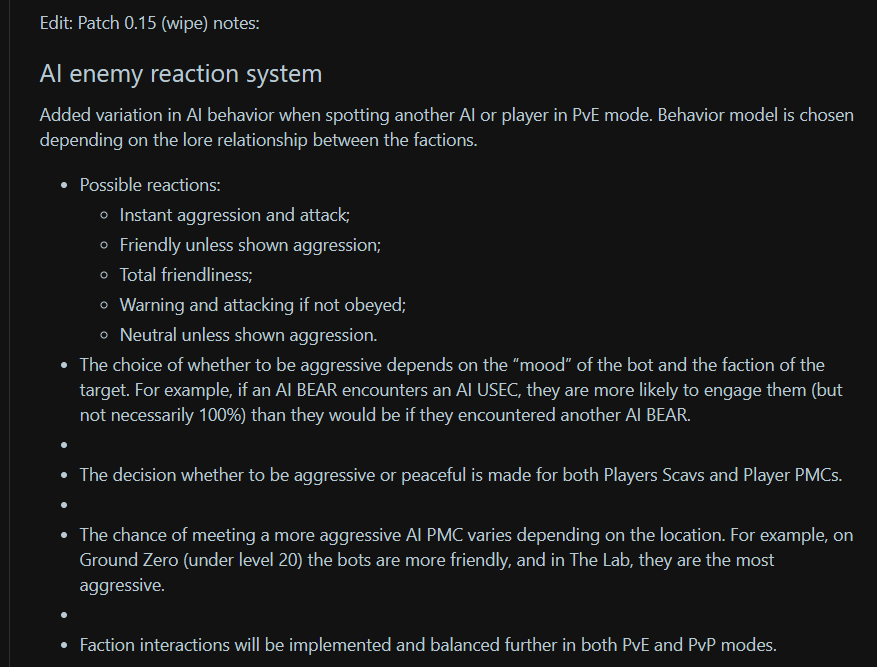 >>50490533 Добавить забыл для понимания: Ты ЧВК - все вокруг агрессивны (есть свои нюансы в паре моментов). Ты дикий - все ЧВК и боссы агрессивны (боссы до определённого уровня репутации скуфщика), убийство диких портит репутацию скупщика (убийство ЧВК, которые убивали диких, играя за дикого - наоборот поднимает репутацию у скупщика) - при маленькой репутации - ВСЕ агрессивны