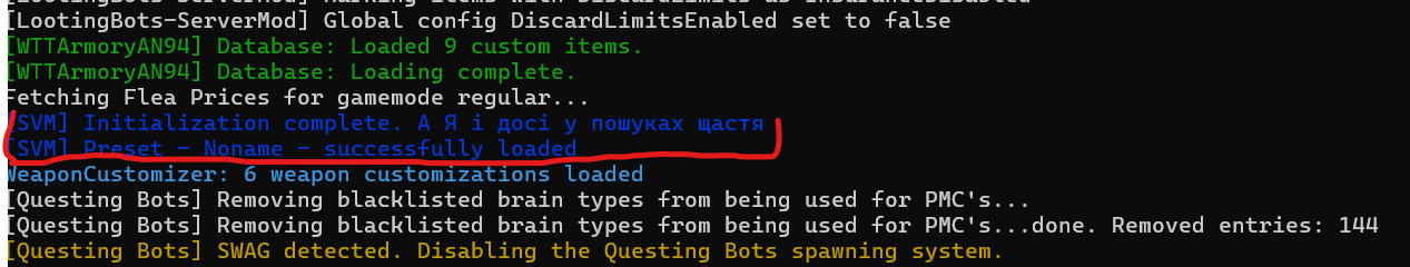Единственно, что проблема с ботами. У меня классика: квестинг ботс, лутинг ботс, биг брейн, сейн, реализм, рейд оверхол из того, что как-то влияет на ботов. Так вот, к проблеме, отказываются они спавниться нормально, боты эти. Вчера на таможне сплошь ЧВК без единого скава, сегодня сплошь скавы без единого ЧВК. Почему так, не знаю. Уже и сваг+донат поставил, но всё одно.