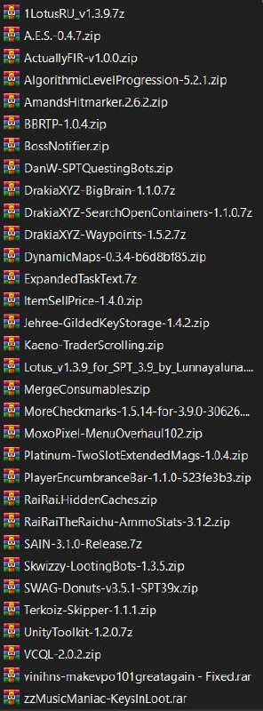 QoL: Better Backpacks Special Slots weapon-customizer AllTheSeasons с кастомным временем, потому что Raid overhaul время рейда меняет и они у меня дольше (ну и длительность сезонов изменил под свои уральские ебеня) Expanded Task Text variable consturction time Immersive Daylight Cycle Realistic Thermal Scopes softcore чисто ради бартерной экономики Optic Rework Uifixes Dynamic Map