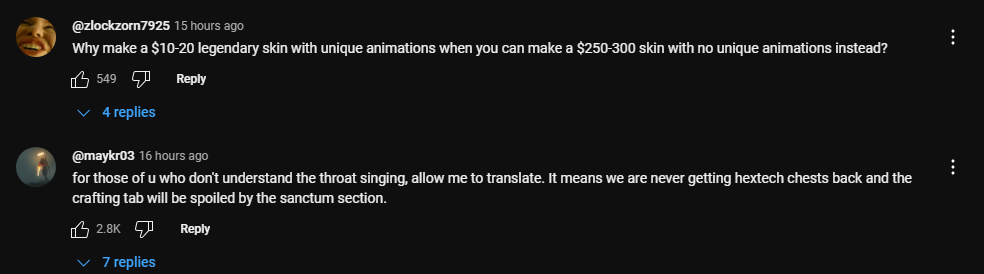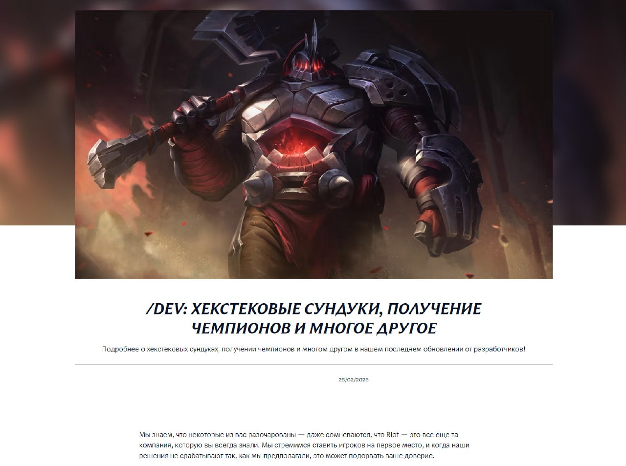 > риот сренькс: мы вернули ер шоп и эмпориум но вы никогда не говорили своему комьюнити, что вы их удаляете??? > риот сренькс: хекстекс честс это вери ансастейнабл анд хертс аур лонг терм профитс а потом вы видимо решили закопать свою компанию, раз даете их еще больше??? > риот сренькс: мы больше не можем делать алтимейт скинс, потому что слишком много работы и слишком много таких скинов сломают игру и затем вы придумали выпускать экзольтед скины за 250 долларов каждый сплит, которые по вашей задумке превосходят все существующие тиры скины скинов, вот так просто, да???