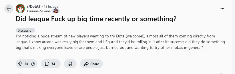 Я реально заебался играть в лигу, она стала калом после 2018 или около того, буквально китайским говном с гачимучи-чемпионами, со скинами "цветные треугольники", повесточкой и неинтересными собитиями, хочу вкатиться в доту и стать дотачмошей, у которых мало того что дохуя красивого шмота, так еще и он либо стоит копейки/можно выменять/обменять, так еще и зачастую он падает бесплатно, но после одной (!) катки в доту у меня горит жопа как у любителя хорошей игры с присутствующим геймплеем.
